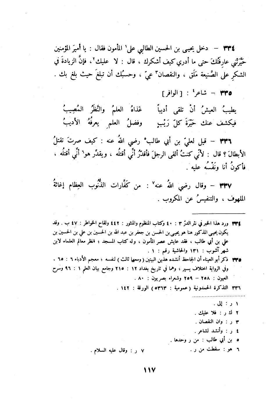 دخل يحيى بن الحسين الطالبي على المأمون فقال: يا أمير المؤمنين حيرتني عارفتك حتى ما أدري كيف أشكرك، قال: لا عليك، فإن الزيادة في الشكر على الصنيعة ملق، والنقصان عي، وحسبك أن تبلغ حيث بلغ بك.