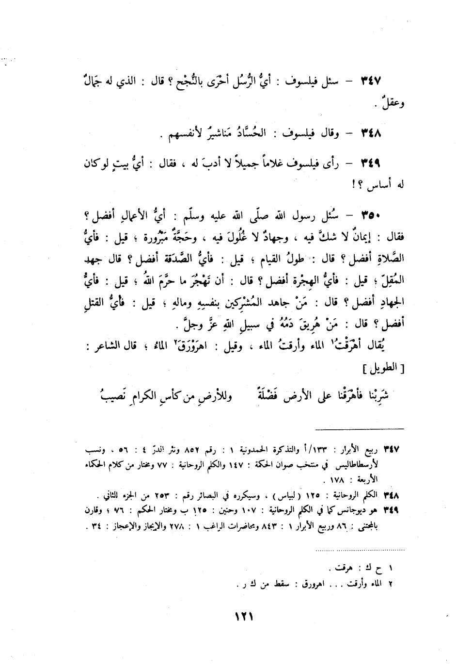 رأى فيلسوف غلاماً جميلاً لا أدب له، فقال: أي بيت لو كان له أساس؟! سئل رسول الله صلى الله عليه وسلم: أي الأعمال أفضل؟ فقال: إيمان لا شك فيه، وجهاد لا غلول فيه، وحجة مبرورة؛ قيل: فأي الصلاة أفضل؟ قال: طول القيام؛ قيل: فأي الصدقة أفضل؟ قال جهد المقل؛ قيل: فأي الهجرة أفضل؟ قال: أن تهجر ما حرم الله؛ قيل: فأي الجهاد أفضل؟ قال: من جاهد المشركين بنفسه وماله؛ قيل: فأي القتل أفضل؟ قال: من هريق دمه في سبيل الله عز وجل.