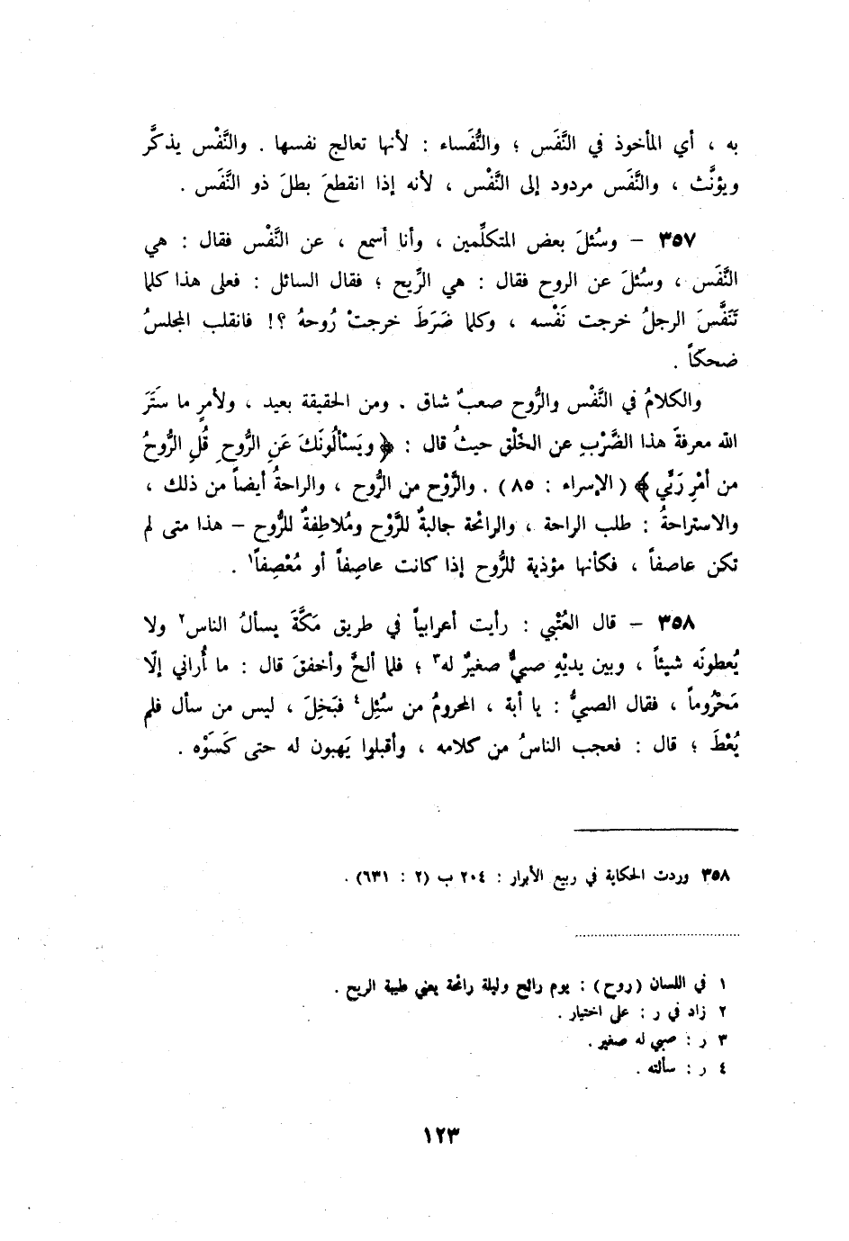 والكلام في النفس والروح صعب ضاق، ومن الحقيقة بعيد، ولأمر ما ستر الله معرفة هذا الضرب عن الخلق حيث قال: " ويسألونك عن الروح قل الروح من أمر ربي " الإسراء: 85. والروح من الروح، والراحة أيضاً من ذلك، والأستراحة: طلب الراحة، والرائحة جالبة للروح وملاطفة للروح - هذا متى لم تكن عاصفاً، فكأنها مؤذية للروح إذا كانت عاصفاً أو معصفاً.