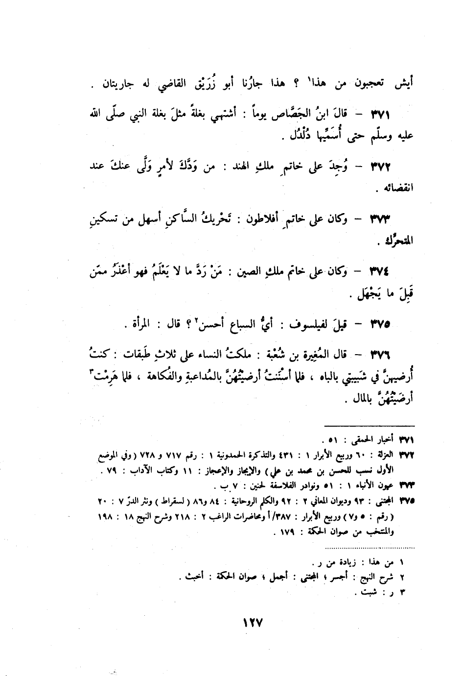 قال المغيرة بن شعبة: ملكت النساء على ثلاث طبقات: كنت أرضيهن في شبيبتي بالباه، فلما أسننت أرضيتهن بالمداعبة والفكاهة، فلما هرمت أرضيتهن بالمال.