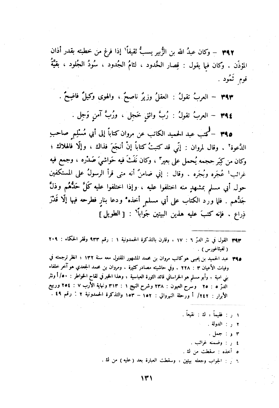 كتب عبد الحميد الكاتب عن مروان كتاباً إلى أبي مسلم صاحب الدعوة، وقال لمروان: إني قد كتبت كتاباً إن أنجع فذاك، وإلا فالهلاك؛ وكان من كبر حجمه يحمل على بعير، وكان نفث فيه حواشي صدره، وجمع فيه غرائب عجره وبحره، وقال: إني ضامن أنه متى قرأ الرسول على المستكفين حول أبي مسلم بمشهد منه اختلفوا عليه، وإذا اختلفوا عليه كل حدهم وذل جدهم. فلما ورد الكتاب على أبي مسلم أخذه ودعا بنار فطرحه فيها إلا قدر ذراع، فإنه كتب عليه هذين البيتين جواباً: الطويل