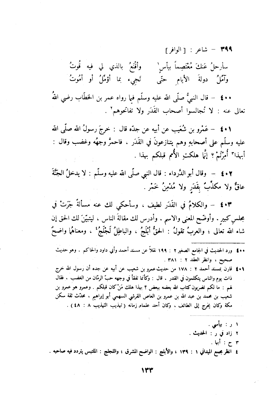 عمرو بن شعيب عن أبيه عن جده قال: خرج رسول الله صلى الله عليه وسلم على أصحابه وهم يتنازعون في القدر، فاحمر وجهه وغضب وقال: أبهذا أمرتم؟ إنما هلكت الأمم قبلكم بهذا.