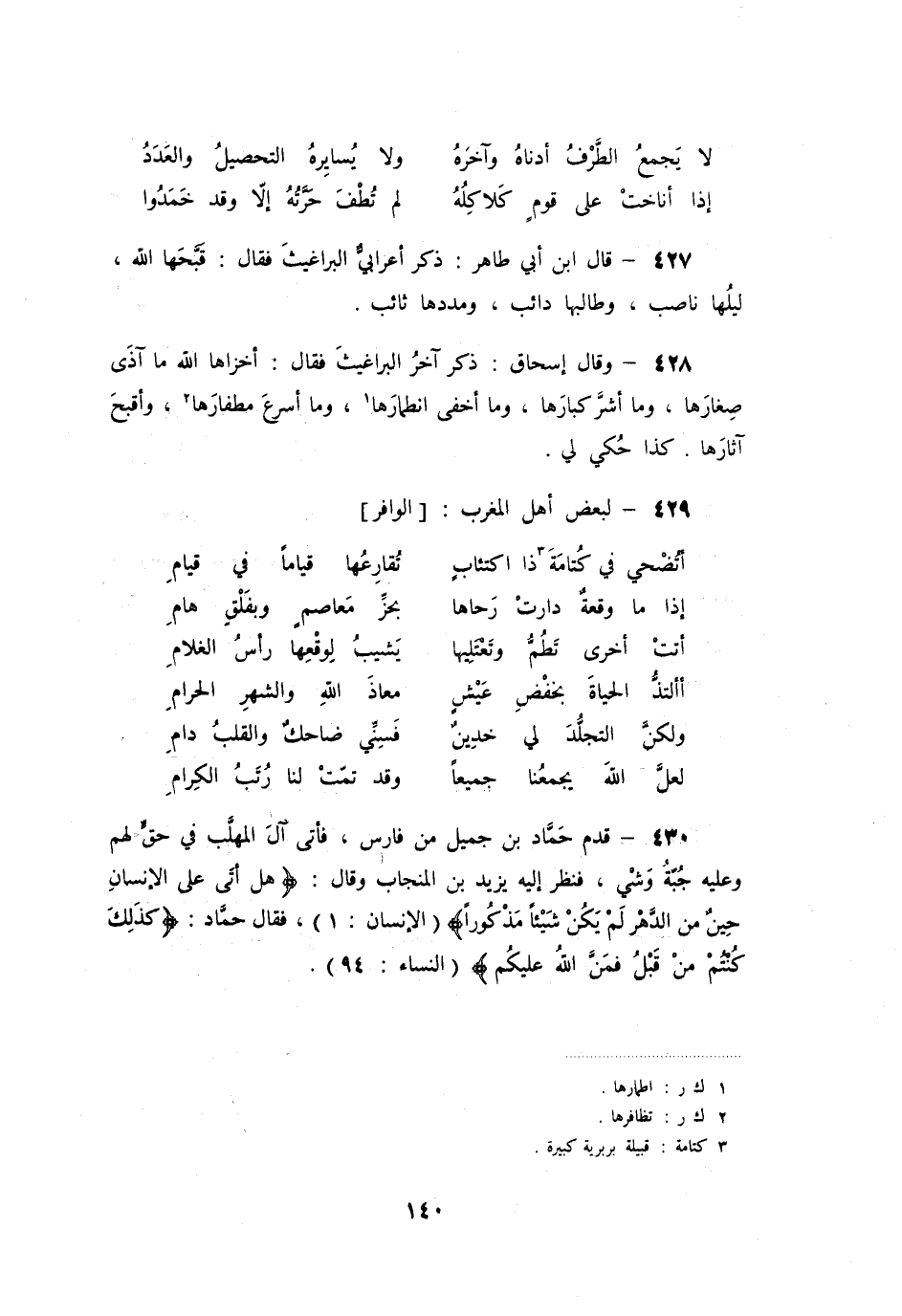 قال ابن أبي طاهر: ذكر أعرابي البراغيث فقال: قبحها الله، ليلها ناصب، وطالبها دائب، ومددها ثائب.