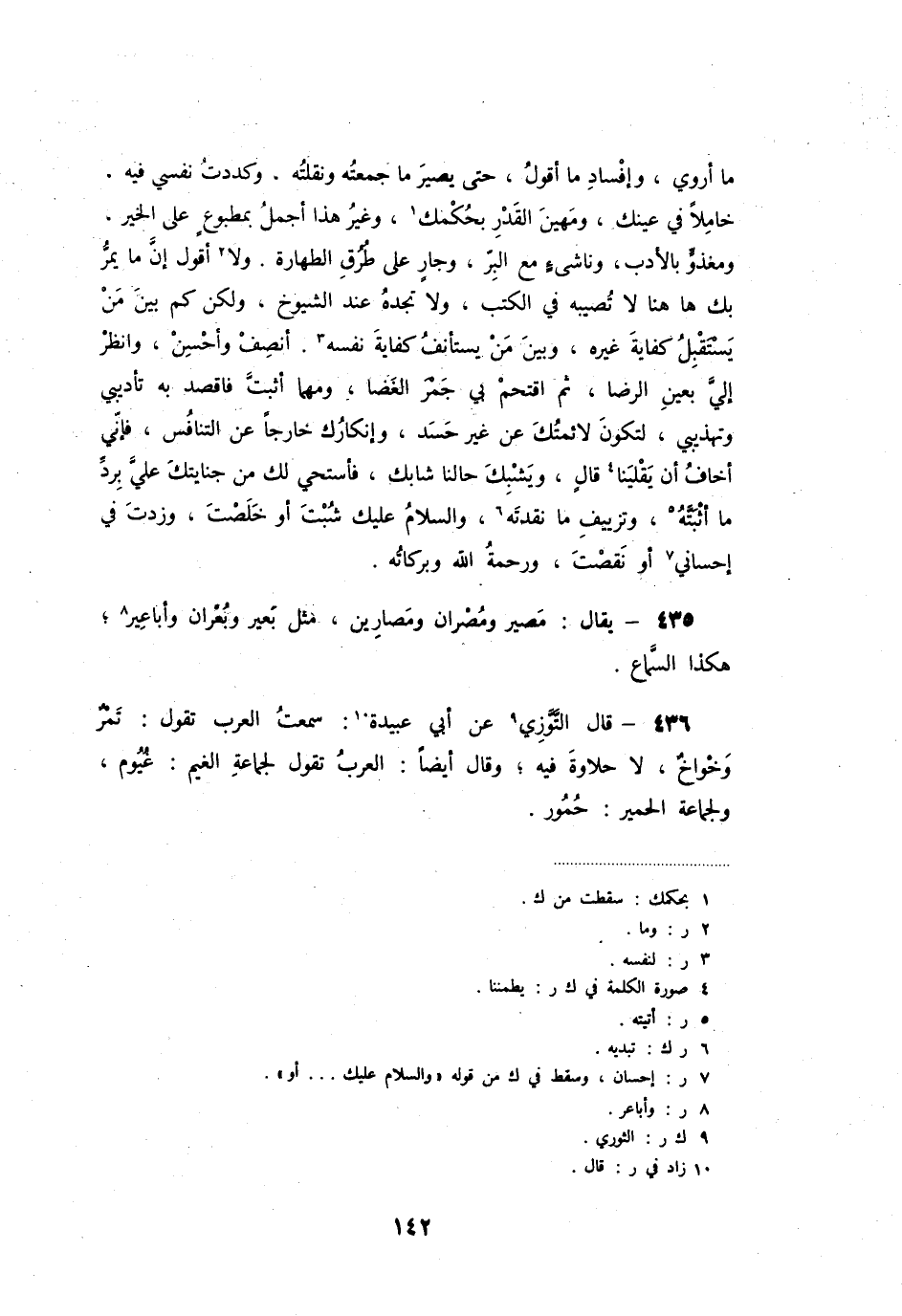 ما أروي، وإفساد ما أقول، حتى يصير ما جمعته ونقلته، وكددت نفسي فيه، خاملاً في عينك، ومهين القدر بحكمك، وغير هذا أجمل بمطبوع على الخير، ومغذو بالأدب، وناشىء مع البر، وجار على طرق الطهارة. ولا أقول إن ما تمر بك ها هنا لا تصيبه في الكتب، ولا تجده عند الشيوخ، ولكن كم بين من يستقبل كفاية غيره، وبين من يستأنف كفاية نفسه. أنصف وأحسن، وانظر إلي بعين الرضا، ثم اقتحم بي حمر الغضا، ومهما أثبت فاقصد به تأديبي وتهذيبي، لتكون لائمتك عن غير حسد، وإنكارك خارجاً عن التنافس، فإني أخاف أن يقلينا قال: ويشبك حالنا شابك، فأستحي لك من جنايتك علي برد ما أثبته، وتزييف ما نقدته، والسلام عليك شبت أو خلصت، وزدت في إحساني أو نقصت، ورحمة الله وبركاته.