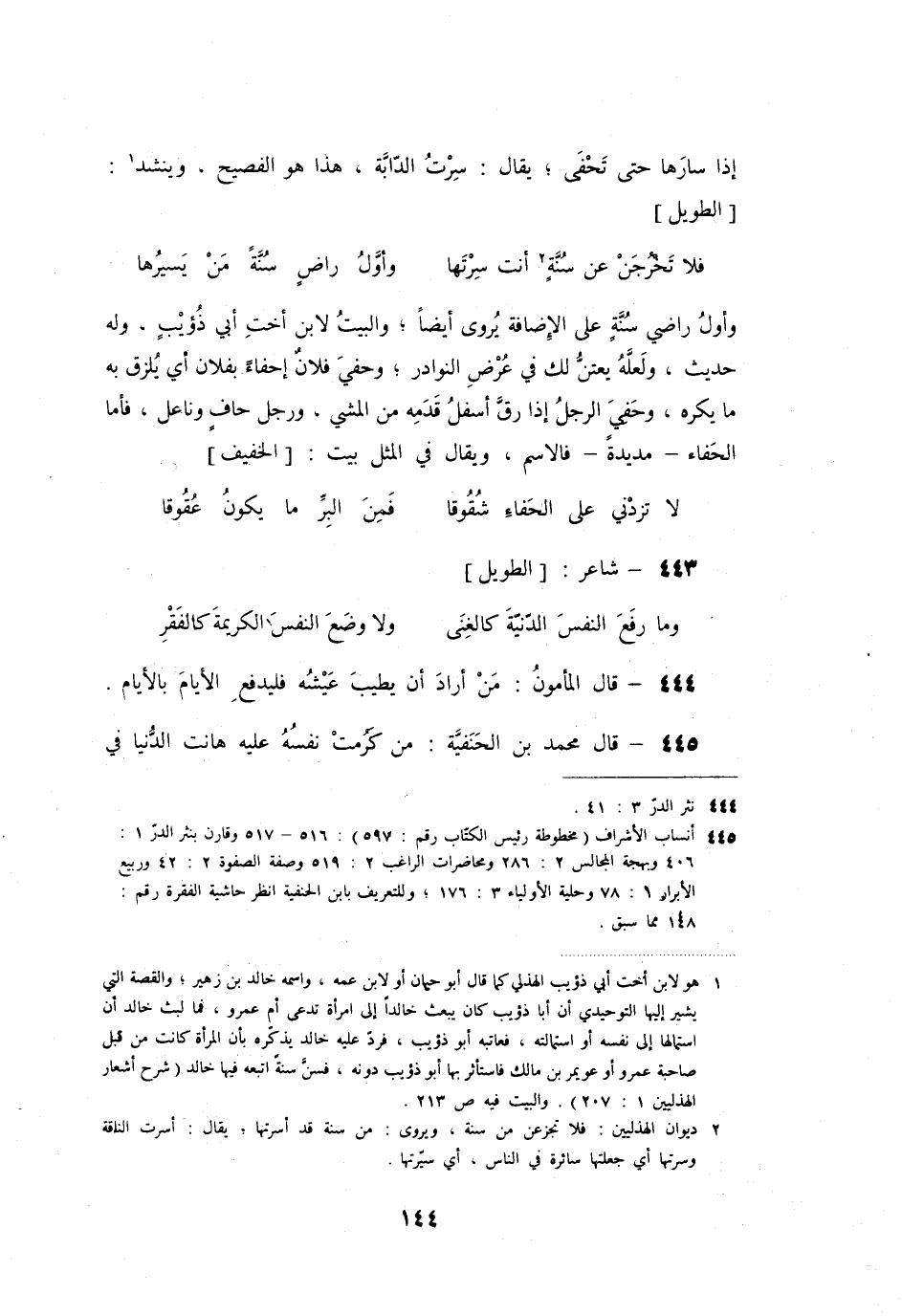وأول راضي سنة على الإضافة يروى أيضاً؛ والبيت لابن أخت أبي ذؤيب، وله حديث، ولعله يعتن لك في عرض النوادر؛ وحفي فلان إحفاء بفلان أي يلزق به ما يكره، وحفي الرجل إذا رق أسفل قدمه من المشي، ورجل حاف وناعل، فأما الحفاء - مديدة - فالأسم، ويقال في المثل بيت: الخفيف