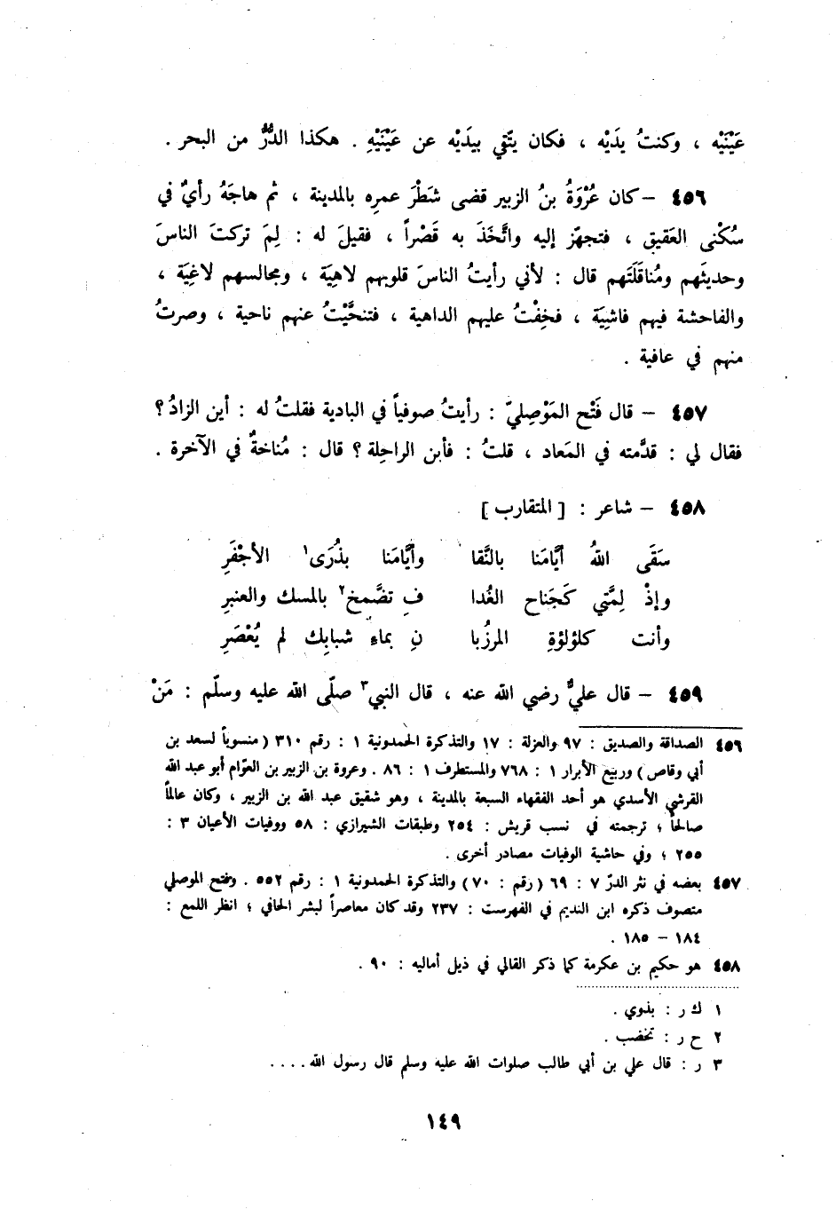 قال فتح الموصلي: رأيت صوفياً في البادية فقلت له: أين الزاد؟ فقال لي: قدمته في المعاد، قلت: فأبن الراحلة؟ قال: مناخة في الآخرة.