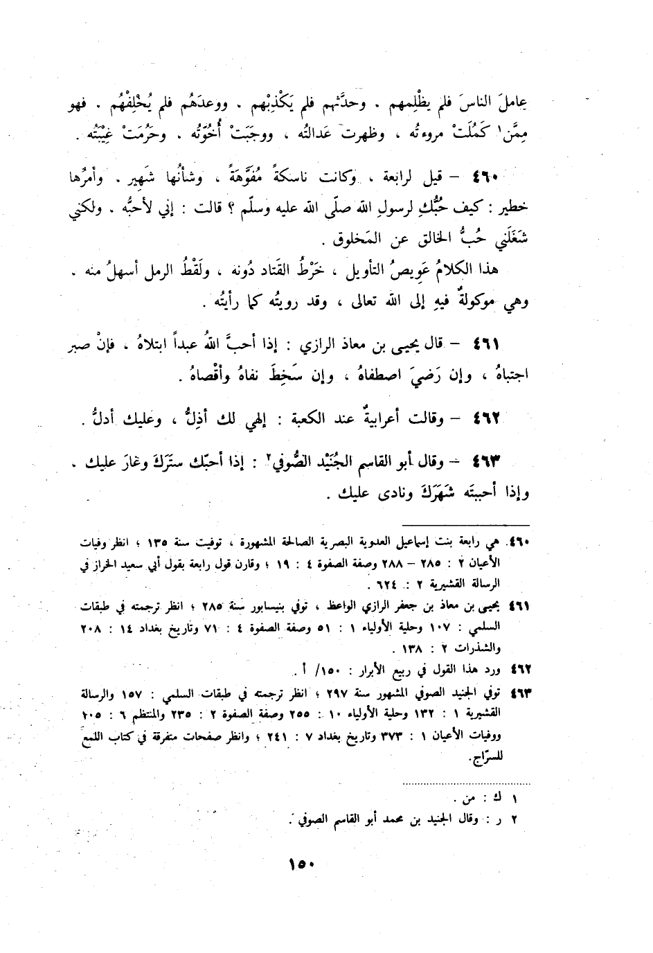 قيل لرابعة، وكانت ناسكة مفوهة، وشأنها شهير، وأمرها خطير: كيف حبك لرسول الله صلى الله عليه وسلم؟ قالت: إني لأحبه، ولكني شغلني حب الخالق عن المخلوق.