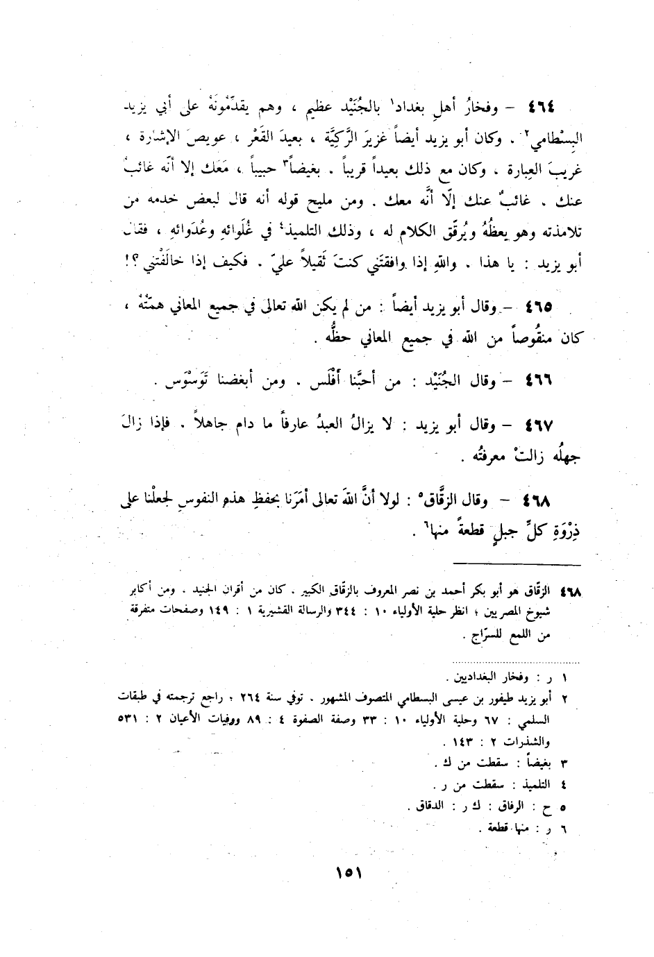 وفخار أهل بغداد بالجنيد عظيم، وهم يقدمونه على أبي يزيد البسطامي، وكان أبو يزيد أيضاً غزير الركية، بعيد القعر، عويص الإشارة، غريب العبارة، وكان مع ذلك بعيداً قريباً، بغيضاً حبيباً، معك إلا أنه غائب عنك، غائب عنك إلا أنه معك. ومن مليح قوله أنه قال لبعض خدمهمن تلامذته وهو يعظه ويرقق الكلام له، وذلك التلميذ في غلوائه وعدوائه، فقال أبو يزيد: يا هذا، والله إذا وافقتني كنت ثقيلاً علي، فكيف إذا خالفتني؟! وقال أبو زيد أيضاً: من لم يكن الله تعالى في جميع المعاني همته، كان منقوصاً من الله في جميع المعاني حظه.