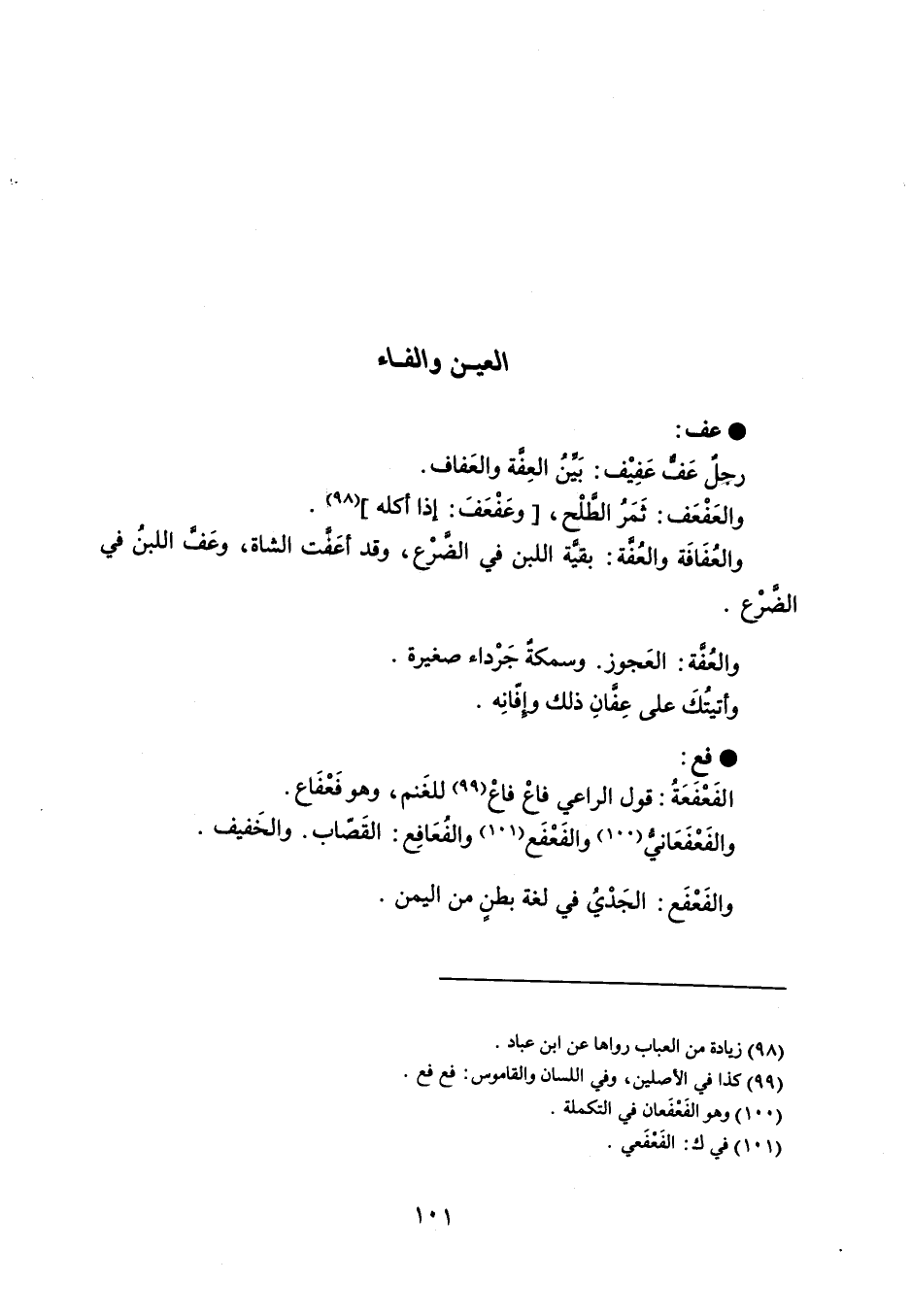 عف رجل عف عَفِيْف : بينُ العِفة والعَفاف . والعَفْعَف : ثَمَرُ الطلْح ، وعفْعَفَ : إذا أكله . والعفَافَة والعُفة : بقية اللبن في الضرْع ، وقد أعَفت الشاة ، وعَف اللبنُ في الضرْع . والعفة : العَجوز . وسمكةٌ جَرْداء صغيرة . وأتيتُكَ على عِفانِ ذلك وإفانِه . فع الفَعْفَعَةُ : قول الراعي فاعْ فاعْ للغَنم ، وهو فَعْفَاع . والفَعْفَعَاني والفَعْفَع والفُعافِع : القَصاب . والخَفيف . والفَعْفَع : الجدْيُ في لغة بطنٍ من اليمن .