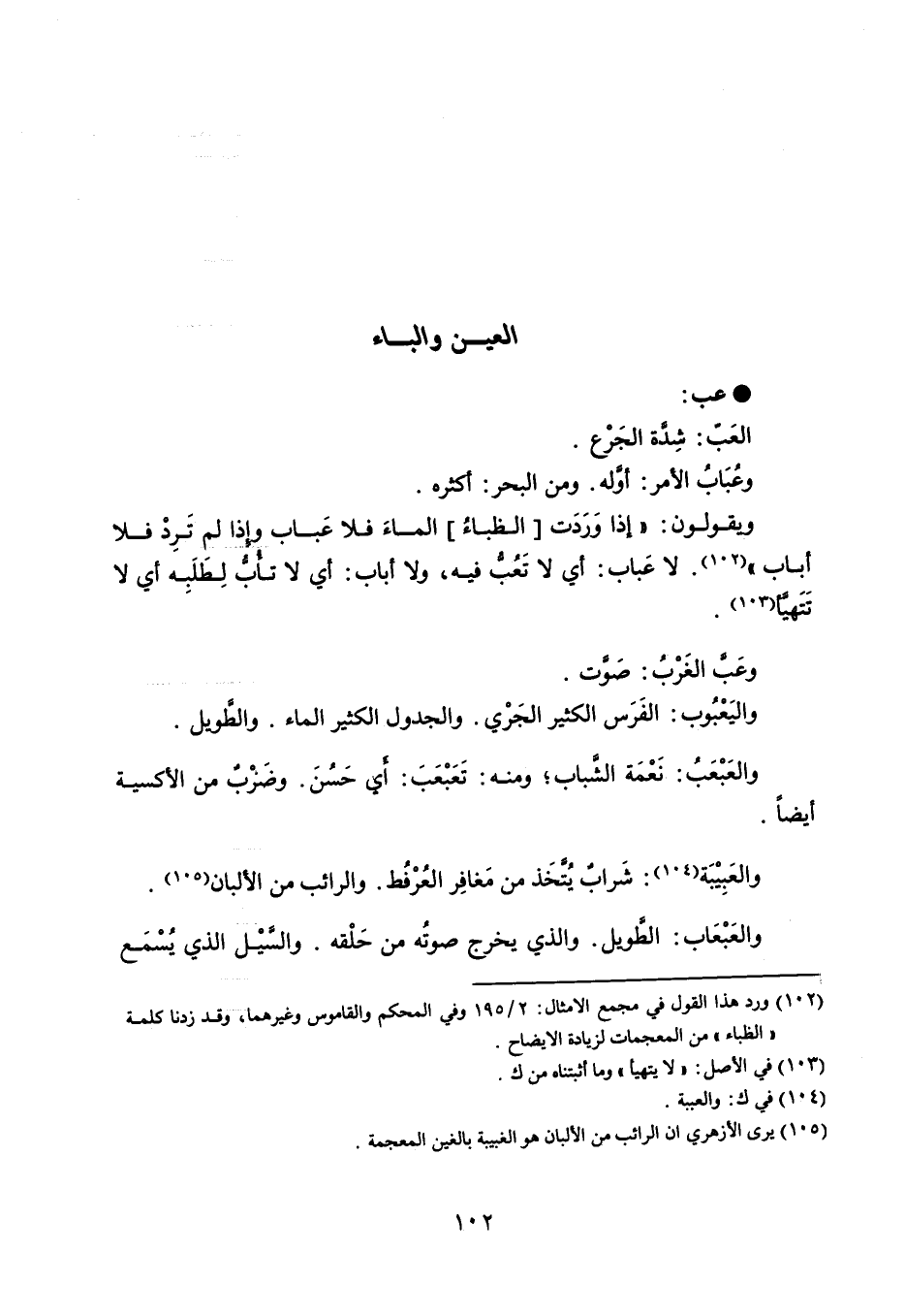 . عب : العَب : شِدة الجَرْع . وعُبَاب الأمر : أوله . ومن البحر : أكثره . ويقولون : ' إذا وَردَت الظباءُ الماءَ فلا عَباب وإذا لم تَرِدْ فلا أباب ' . لا عَباب : أي لا تعب فيه ، ولا أباب : أي لا تأب لِطَلَبه أي لا تتهيأ . وعب الغَرْبُ : صَوت . واليَعْبُوب : الفَرَس الكثير الجَرْي . والجدول الكثير الماء . والطويل . والعَبْعَبُ : نَعْمَة الشباب ؛ ومنه : تَعَبْعَبَ : أي حَسُنَ . وضَرب من الأكسية أيضاً والعَبِيْبَة : شَراب يًتخَذ من مَغافِر العرْفُط . والرائب من الألبان . والعَبْعَاب : الطويل . والذي يخرج صوتُه من حَلْقه . والسيْل الذي يُسمَع