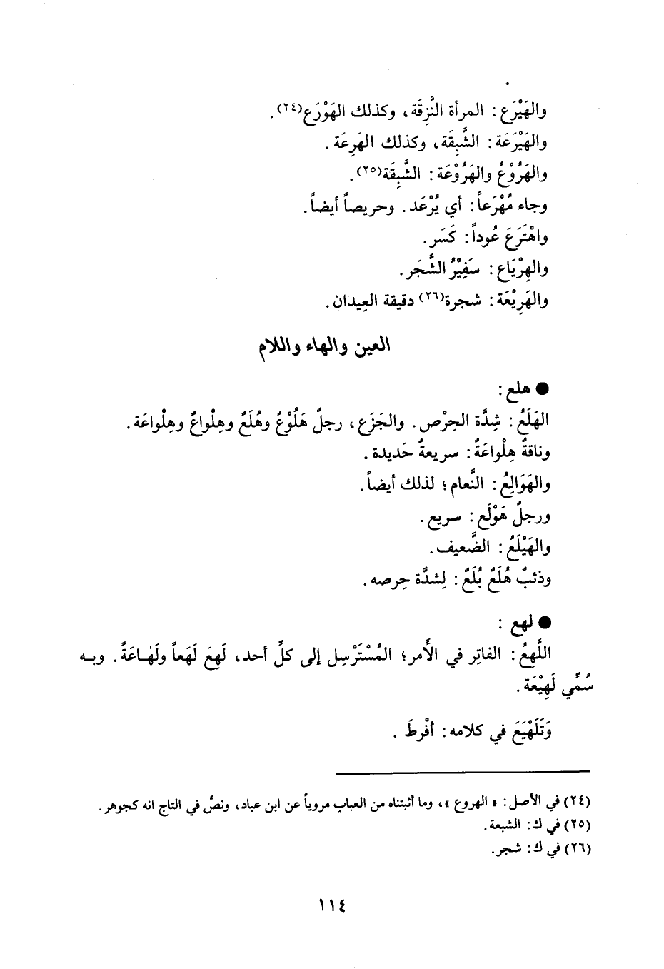 هلع الهَلَعُ : شدَّة الحِرْص . والجَزَع ، رجلٌ هَلُوْع وهُلَع وهِلْواع وهِلْواعَة . وناقةٌ هِلْواعَةٌ : سريعةٌ حَديدة . والهَوَالِعُ : النَّعام ؛ لذلك أيضاً . ورجلٌ هَوْلَع : سريع . والهَيْلَعُ : الضعيف . وذئبٌ هُلَعٌ بُلَع : لِشدًة حِرصه . لهع اللًهعُ : الفاتِر في الأمر ؛ المُسْتَرْسِل إلى كلِّ أحد ، لَهعَ لَهَعاً ولَهاعَةً . وبه سمي لَهِيْعَة . وَتَلَهْيَعَ في كلامه : أفْرطَ .