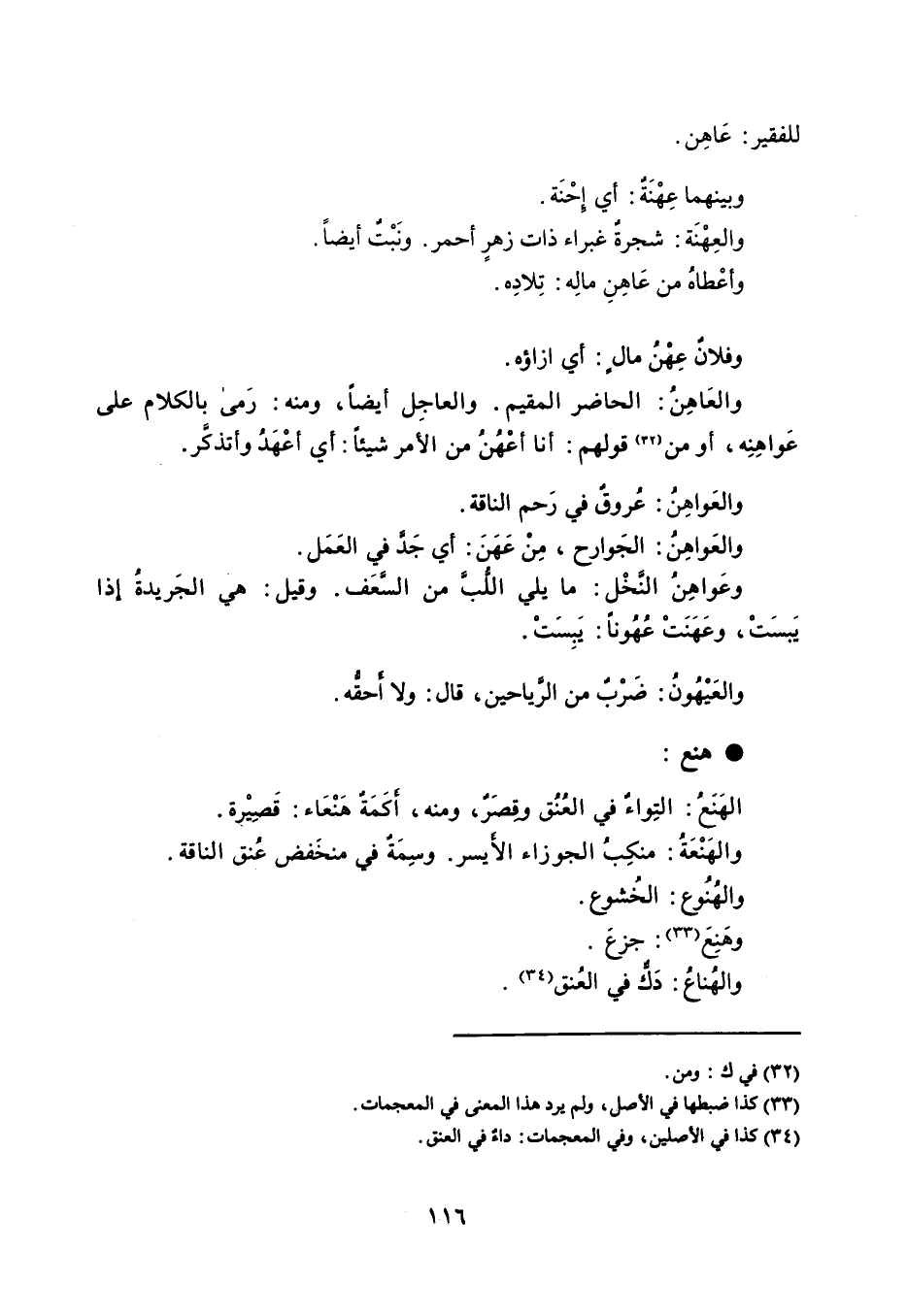 للفقير : عَاهِن . وبينهما عِهْنَةٌ : أي إِحْنَة . والعِهْنَة : شجرةٌ غبراء ذات زهرٍ أحمر . ونَبْت أيضاً . وأعْطاه من عَاهِنِ مالِه : تِلادِه . وفلانٌ عِهْن مالً : أي إزاءه . والعَاهِن : الحاضر المقيم . والعاجِل أيضاً ، ومنه : رَمى بالكلام على عَواهِنِه ، أو من قولهم : أنا أعْهن من الأمر شيئاً : أي أعْهَد وأتذكَر . والعَواهِن : عًروق في زحم الناقة . والعواهِنُ : الجَوارح ، مِنْ عَهَنَ : أي جد في العَمَل . وعَواهِن النخْل : ما يلي اللب من السعَف . وقيل : هي الجَريدةُ إذا يَبسَتْ ، وعَهَنَتْ عُهُوناً : يَبِسَتْ . والعَيْهُونُ : ضَرْبٌ من الرياحين ، قال : ولا أحقه . هنع الهَنع : التِواء في العُنُق وقصَرٌ ، ومنه ، أكَمَة هَنْعَاء : قَصِيْرة . والهَنْعَة : منكب الجوزاء الأيسر . وسِمَة في منخَفض عنق الناقة . والهُنُوع : الخُشوع . وهَنِعَ : جزعَ . والهُناعُ : دك في العُنق .