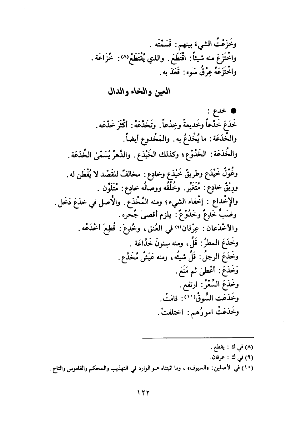 خدع خدَع خَدْعاً وخَديعةً وخِدْعاً . وتَخدعهُ : كْثَرَ خَدْعَه . والخُدَعَة : ما يُخْدَعُ به . والمَخدوع أيضاً . والخُدعَة : الخدُوْع ؛ وكذلك الخيدع . والدهر يُسَمى الخُدَعَة . وغُوْلٌ خَيْدَع وطريق خَيْدَع وخادِع : مخالفٌ للقَصْد لا يفطن له . ورِيْقٌ خادِع : مُتَغير . وخُلُقه ووصالُه خادِع : مُتَلون . والإخْداع : إخْفاء الشيء ؛ ومنه المخْدَع . والأصل في خدَع دَخَل . وضَب خَدع وخَدُوْعٌ : يلزم أقصى جُحره . والأخْدَعان : عِرْقان في العُنق ، وخُدِع : قُطِعَ أخْدَعُه . وخَدَع المطرُ : قَل ، ومنه سِنونَ خَدًاعَة . وخَدَعَ الرجلُ : قَل شيئُه ، ومنه عَيْشٌ مُخَدع . وَخدَع : أعْطى ثم مَنَعَ . وخدَع السعْرُ : ارتفع . وخَدَعَت السوقُ : قامَتْ . وخَدَعَتْ أمورهم : اختلفتْ .