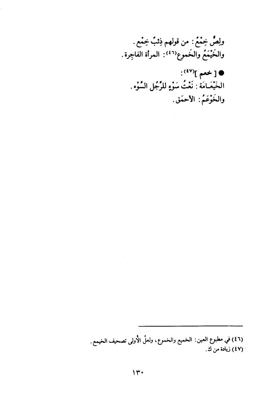 ولص خمع : من قولهم ذئب خمع . والخيمع والخموع : المرأة الفاجرة . خعم الخَيْعَامَة : نَعْتُ سَوء للرجُل السوْء . والخَوعَم : الأحمَق .