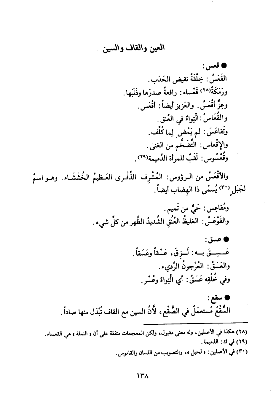قعس القَعَسُ : خِلْقَة نقيض الحدَب . ورَمَكَةٌ قَعْساء : رافعةٌ صدرها وذَنَبَها . وعِز أقْعَسُ . والعَزيز أيضاً : أقْعَس . والقُعَاسُ : الْتِواءٌ في العُنق . وتَقاعَسَ : لم يَمْض لِما كلف . والإقْعاس : التضَخم من الغنى . وقُعْسُوس : لَقَبٌ للمرأة الدميمة . والأقْعَسُ من الرؤوس : المُشْرِف الذَفْرى العَظيمُ الخُشَشَاء . وهو اسمٌ لجَبَل يُسمى ذا الهضاب أيضاً . ومُقاعِس : حَي من تَميم . والقَوْعَسُ : الغليظُ العُنُقِ الشديدُ الظهر من كل شيء . عسق عَسِقَ به : لَزِقَ ، عسقاً وعَسقاً . والعَسَقُ : العُرْجونُ الرديء . وفي خلُقِه عَسَق : أي الْتِواءٌ وعُسر . سقع السقْعُ مُستعمَل في الصقْع ، لأن السين مع القاف تُبْدَل منها صاداً .