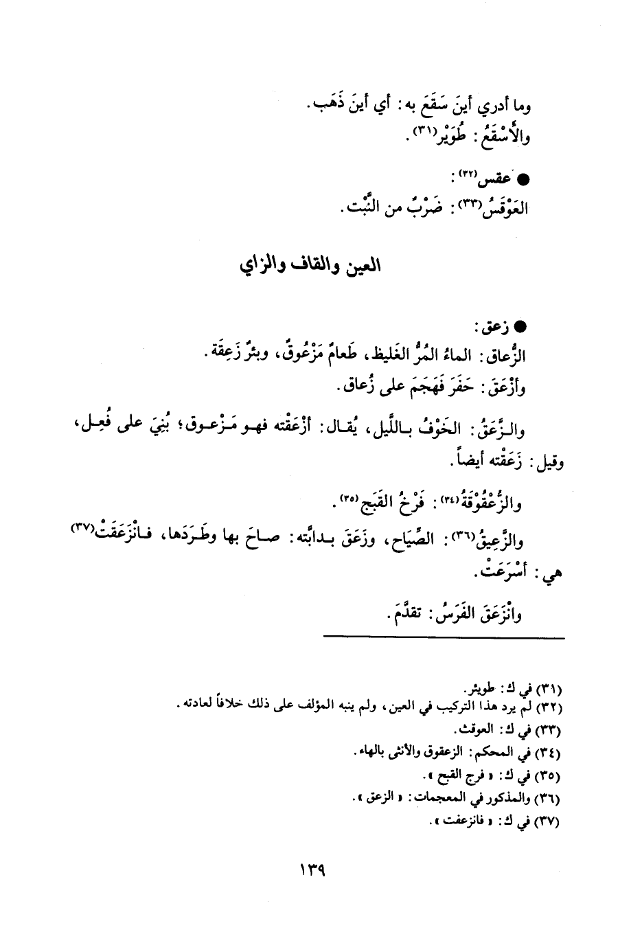 زعق الزُّعاق : الماءُ المُرُّ الغَلط ، طَعامٌ مَزْعُوقٌ ، وبئرٌ زَعِقة . وأزْعَقَ : حَفَر َفَهَجَمَ على زُعاق . والزَعَقُ : الخَوْفُ بالليل ، يُقال : أزْعَقْته فهو مَزْعوق ؛ بُنِيَ على فُعِل ، وقيل : زَعَقْته أيضاً . والزعقُوْقَة : فَرْخُ القَبَج . والزعِيقُ : الصيَاح ، وزَعَقَ بدابته : صاحَ بها وطَردها ، فانْزَعَقَتْ هي : أسْرَعَتْ . وانْزَعَقَ الفَرَسُ : تقدمَ .