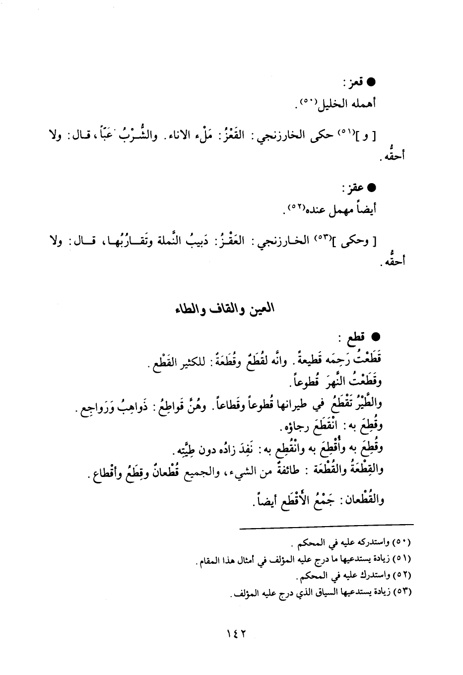 قطع قَطَعْتُ رَحِمَه قَطيعةً . وانه لقُطَع وقُطَعَة : للكثير القَطْع . وقَطَعْتُ النهرَ قُطوعاً . والطيْرُ تَقْطَعُ في طيرانها قُطوعاً وقَطاعاً . وهنَ قَواطِعُ : ذَواهبُ وَرَواجِع . وقُطِعَ به : انْقَطَعَ رجاؤه . وقُطِعَ به واقْطِعَ به وانْقُطِع به : نَفِدَ زاده دون طيتِه . والقِطْعَةُ والقُطْعَة : طائفةٌ من الشيء ، والجميع قُطْعان وقِطَع وأقْطاع . والقُطْعان : جَمْعُ الأقْطَع أيضاً .