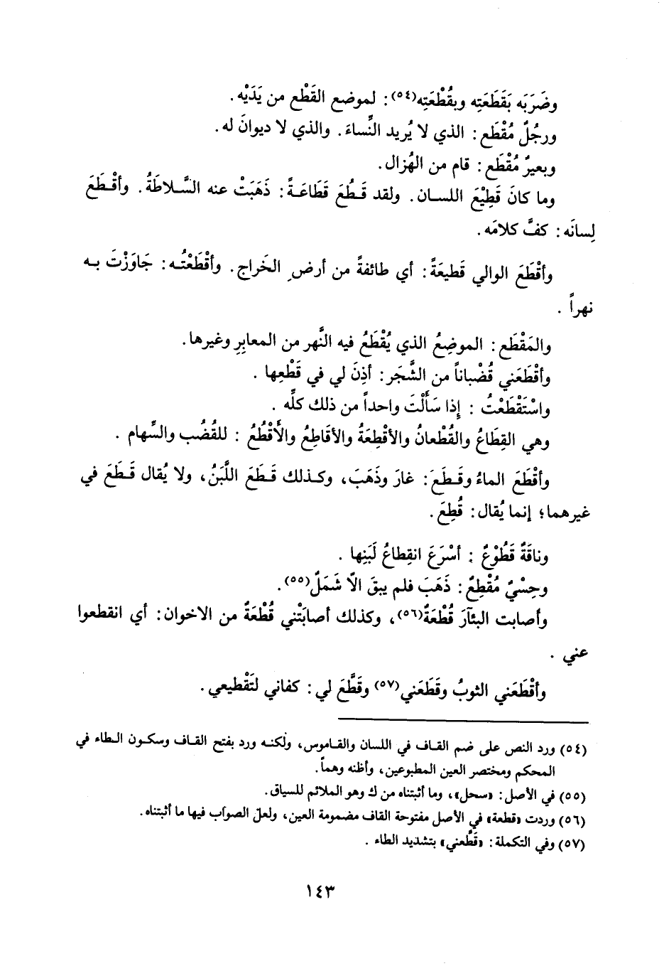 وضَرَبَه بَقَطَعَتِه وبقُطْعَتِه : لموضع القطع من يَدَيْه . ورجُلٌ مُقْطَع : الذي لا يُريد النساءَ . والذي لا ديوانَ له . وبعير مُقْطَع : قام من الهُزال . وما كانَ قَطيِع اللسان . ولقد قطعُ قطاعَةً : ذَهَبَتْ عنه السلاطَةُ . وأقْطَعَ لِسانَه : كف كلامَه . وأقْطَعَ الوالي قَطيعَةً : أي طائفةً من أرض الخَراج . وأقْطَعْتُه : جَاوَزْتَ به نهراً . والمَقْطَع : الموضِعُ الذي يقْطَعُ فيه النهر من المعابِرِ وغيرها . وأقْطَعَني قضباناً من الشَّجَر : أذِنَ لي في قَطْعِها . واسْتَقْطَعْتُ : إِذا سَألْتَ واحداً من ذلك كلهَ . وهي القِطَاعُ والقُطْعانُ والأقْطِعَةُ والأقَاطِعُ والأقْطُعُ : للقُضُب والسهام . وأقْطَعَ الماءُ وقَطَعَ : غارَ وذَهَبَ ، وكذلك قَطَعَ اللبَنُ ، ولا يُقال قطعً في غيرهما ؛ إنما يُقال : قُطِعَ . وناقَةٌ قَطُوْع : أسْرَعَ انقِطاعُ لَبَنِها . وحسْيٌ مُقْطِعٌ : ذهَبَ فلم يبق إلا شَمَلٌ . وأصابت البئآرَ قُطْعَة ، وكذلك أصابتْني قُطْعَةٌ من الإخوان : أي انقطعوا وأقْطَعَني الثوبُ وقطَعَني وقَالَ لي : كفاني لتَقْطيعي .