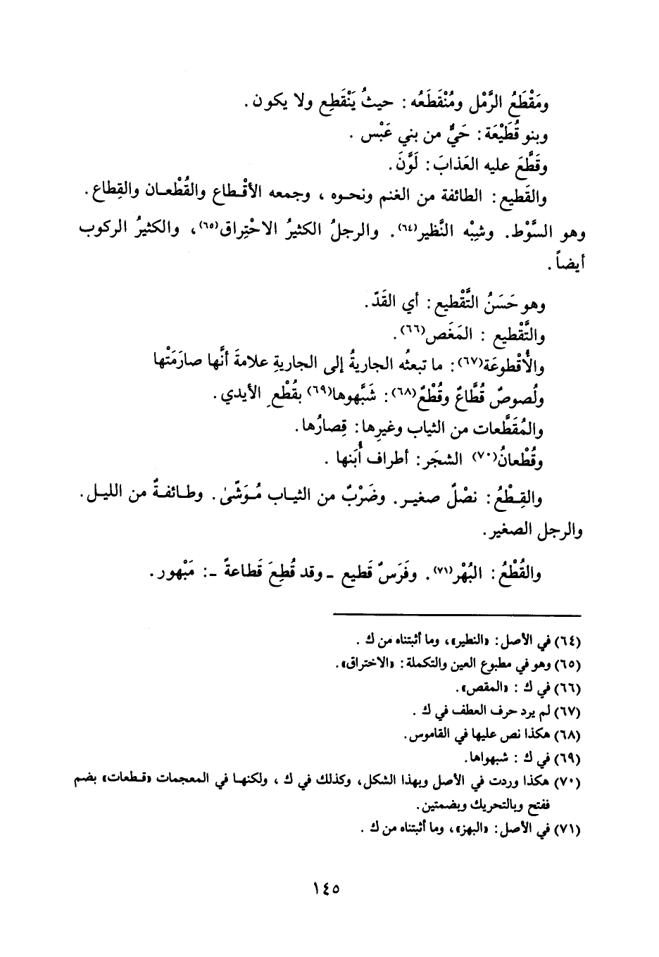 ومَقْطعُ الرَّمل ومُنْقَطَعُه : حيث يَنْقَطِع ولا يكون . وبنو قُطيْعَة : حَي من بني عَبْس . وقَالعَ عليه العذابَ : لونَ . والقَطيع : الطائفة من الغنم ونحوه ، وجمعه الأقْطاع والقُطْعان والقِطاع . وهو السَّوْط . وشِبْه النَظير . والرجلُ الكثيرُ الاحْتِراق ، والكثير الركوب أيضاً . وهو حَسَن التقْطيع : أي القد . والتقْطيع : المَغَص . والاقْطوعَة : ما تبعثُه الجارية إلى الجاريةِ علامةَ أنها صارَمَتْها . ولُصوص قُطاعٌ وقطْع : شَبهوها بقُطْع الأيدي . والمقَاطعات من الثياب وغيرِها : قِصارُها . وقطْعان الشجَر : أطراف ابَنها . والقِطْعُ : نصْلً صغير . وضَرب من الثياب مُوَشّى . وطائفةٌ من الليل . والرجل الصغير . والقُطْع : البُهْر . وفَرَس قَطيع - وقد قُطِعَ قَطاعة - : مَبْهور .