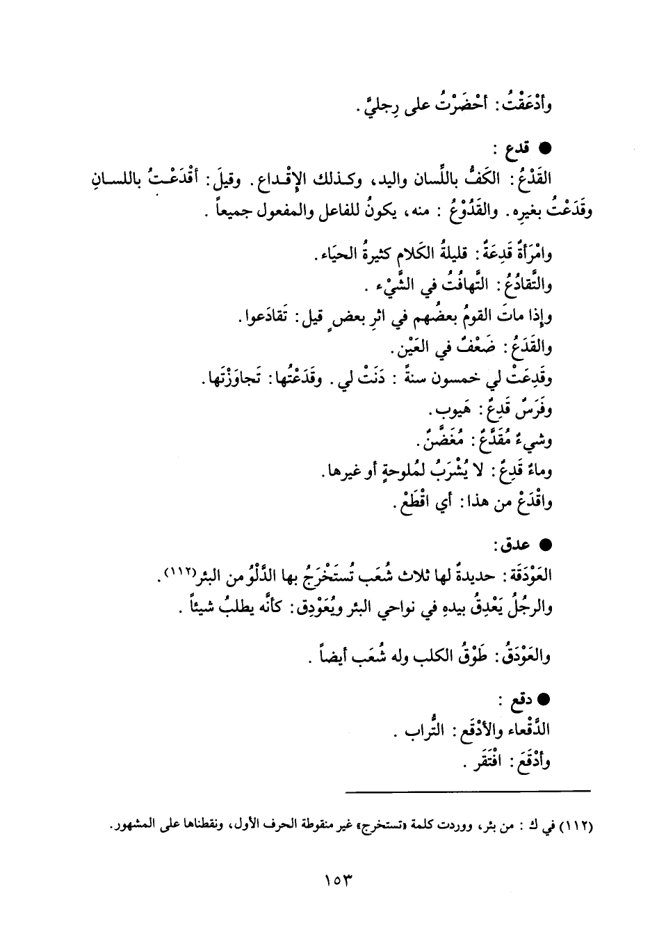 وأدْعَقْتُ : أحْضَرْتُ على رجلي . قدع القَدْعُ : الكف باللسان واليد ، وكذلك الإقْداع . وقيلَ : أقْدَعْتُ باللسانِ وقَدَعْتُ بغيرِه . والقدُوْعُ : منه ، يكونُ للفاعل والمفعول جميعاً . وامرَأةٌ قَدِعَةٌ : قليلةُ الكَلام كثيرةُ الحيَاء . والتقادُعُ : التَهافُتُ في الشيْء . وإذا ماتَ القومُ بعضهم في أثرِ بعض قيل : تَقادَعوا . والقَدع : ضَعف في العَيْن . وقَدِعَت لي خمسون سنةً : دَنَتْ لي . وقَدَعْتُها : تَجاوَزْتَها . وفَرَسٌ قَدِعٌ : هَيوب . وشيء مُقَدَّع : مُغَضنٌ . وماءٌ قَدِعٌ : لا يُشْرَبُ لمُلوحةٍ أو غيرها . واقْدَعْ من هذا : أي اقْطَعْ . عدق العَوْدَقَة : حديدةٌ لها ثلاث شُعَب تُستَخْرَجُ بها الدلْو ُمن البئر والرجُلُ يَعْدِقُ بيده في نواحي البئر ويُعَوْدِق : كأنه يطلبُ شيئاً . والعَودقُ : طَوْقُ الكلب وله شُعَب أيضاً . دقع الدقْعاء والأدْقَع : التراب . وأدْقَعَ : افْتَقَر .