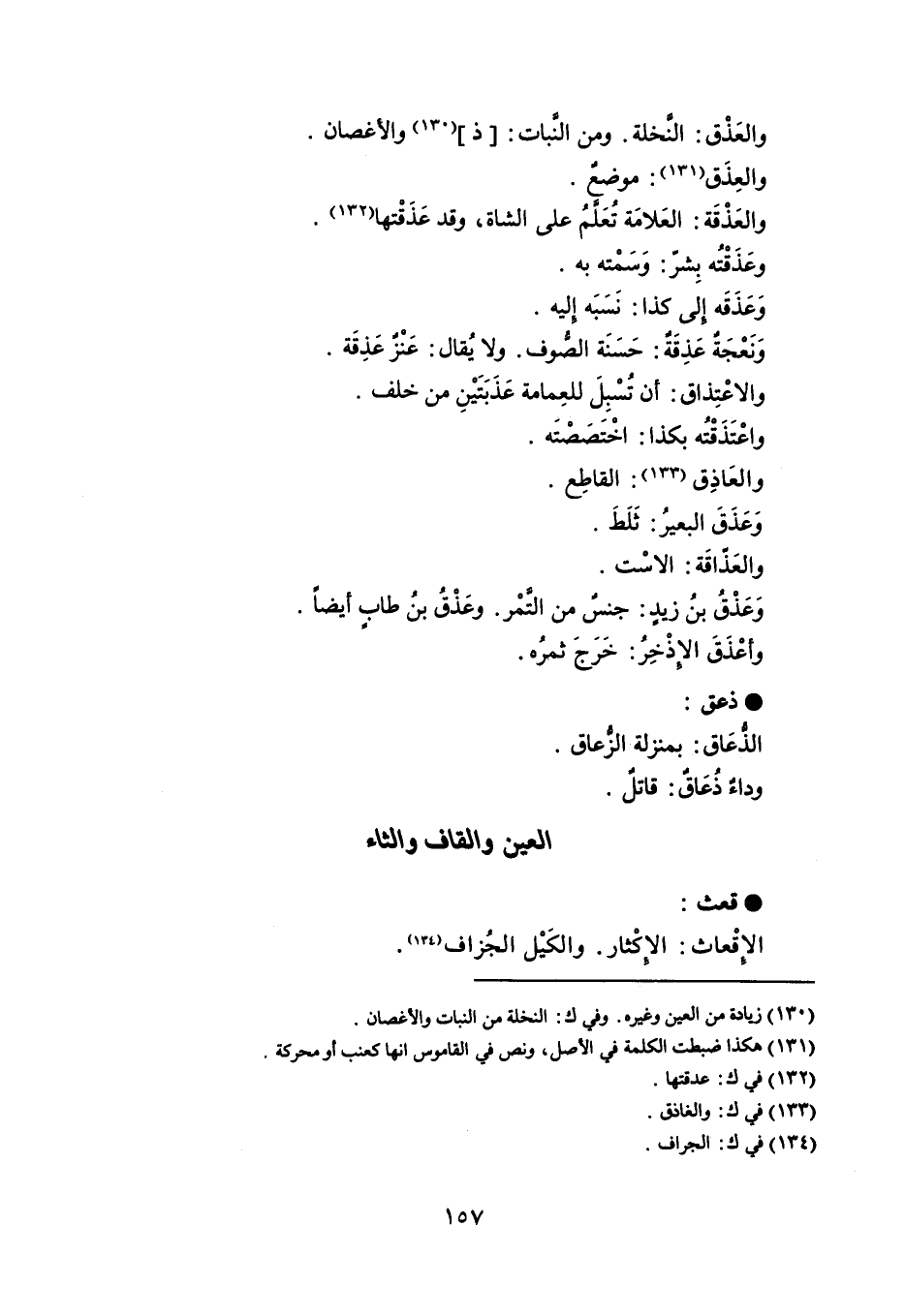 والعَذْق : النخلة . ومن النبات ، والأغصان . والعِذَق : موضعٌ . والعَذْقة : العَلامَة تُعَلمُ على الشاة ، وقد عَذَقْتها . وعَذقْتُه بِشر : وَسَمْته به . وَعَذَقَه إلى كذا : نَسَبه إليه . وَنَعْجَة عَذِقَة : حَسنَة الصُّوف . ولا يُقال : عَنْزٌ عَذِقَة . والاعْتذاق : أن تُسْبِل للعِمامة عَذَبَتَيْنِ من خلف . واعْتَذَقْتُه بكذا : اخْتَصَصْتَه . والعَاذِق : القاطِع . وَعَذَقَ البعيرُ : ثَلَطَ . والعَذاقة : الاسْت . وَعَذْقُ بنُ زيدٍ : جنسٌ من التمْر . وعذْقُ بنً طابٍ أيضاً . وأعذَقَ الإذْخِرُ : خَرَجَ ثمرهُ . ذعق الذعَاق : بمنزلة الزْعاق . وداء ذُعَاقٌ : قاتل .