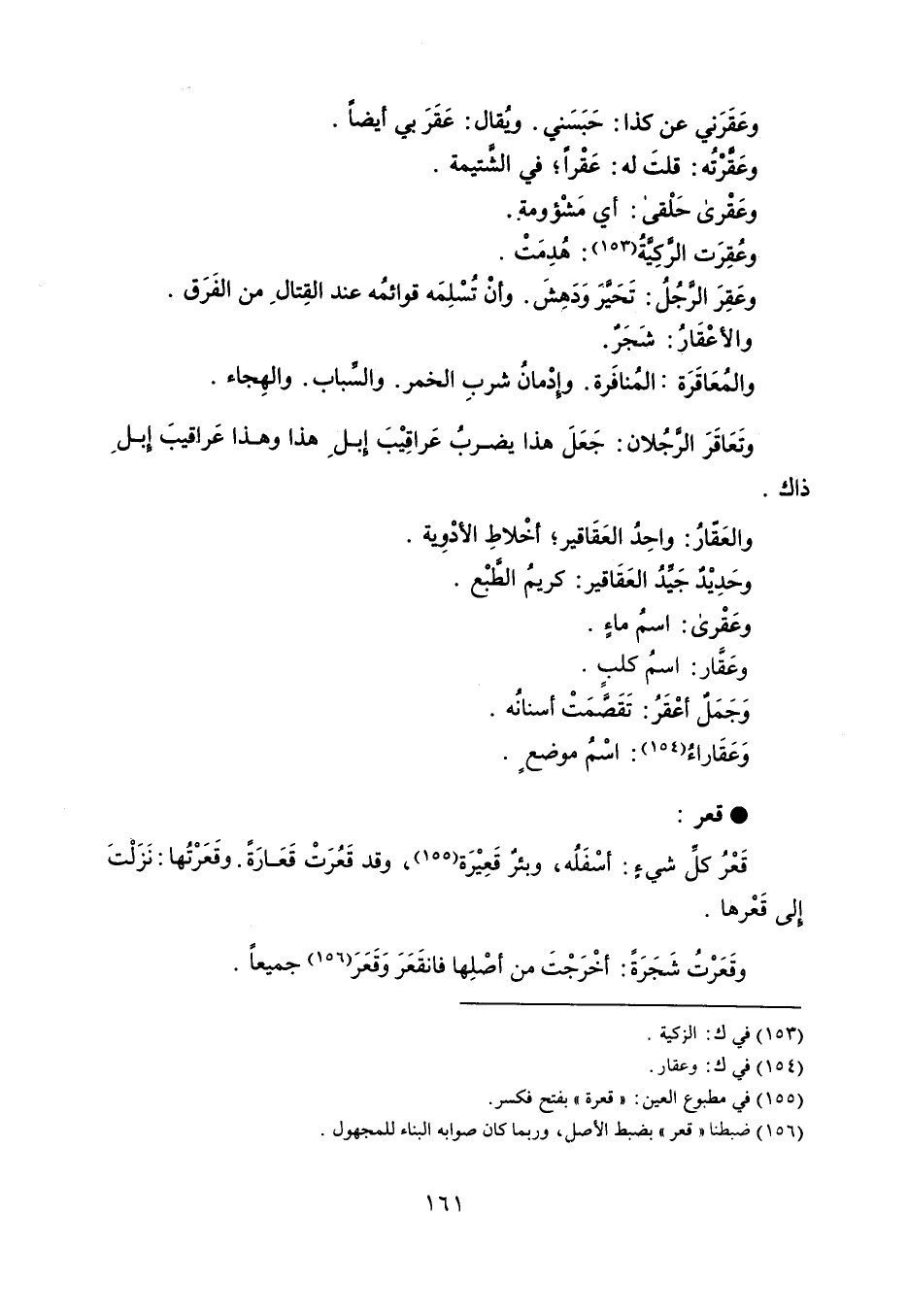 وعَقَرَني عن كذا : حَبَسَني . ويُقال : عَقَرَ بي أيضاً . وعقرتُه : قلتَ له : عَقْراً ؛ في الشتيمة . وعقْرى حَلْقى : أي مَشْؤومة . وعُقِرَت الركِيةُ : هزِمَتْ . وعَقِرَ الرجُلُ : تَحيرَ وَدَهِشَ . وأنْ تُسْلِمَه قوائمُه عند القِتال من الفَرَق . والأعْقَارُ : شَجَرٌ . والمُعَاقَرَة : المُنافَرة . وإدمانُ شربِ الخمر . والسباب . والهِجاء . وتعَاقَرَ الرجُلان : جَعَلَ هذا يضربُ عَراقِيْبَ إبل هذا وهذا عَراقيبَ إبل ذاك . والعَقارُ : واحِدُ العَقَاقير ؛ أخْلاطِ الأدْوِية . وحَدِيْدٌ جَيدُ العَقَاقير : كريمُ الطبْع . وعَقْرى : اسمُ ماءٍ . وعَقَار : اسمُ كلب . وَجَمَلٌ أعْقَرُ : تَقَصًّمَتْ أسنانُه . وَعَقَاراءُ : اسْمُ موضع . قعر قَعْرُ كل شيءٍ : أسْفَلُه ، وبئرٌ قَعِيْرَة ، وقد قَعُرَتْ قَعَارَةً . وقَعَرْتًها : نَزَلْتَ إلى قَعْرها . وقَعَرْتُ شَجَرَةً : أخْرَجْتَ من أصْلِها فانقَعَرَ وَقَعَرا جميعاً .