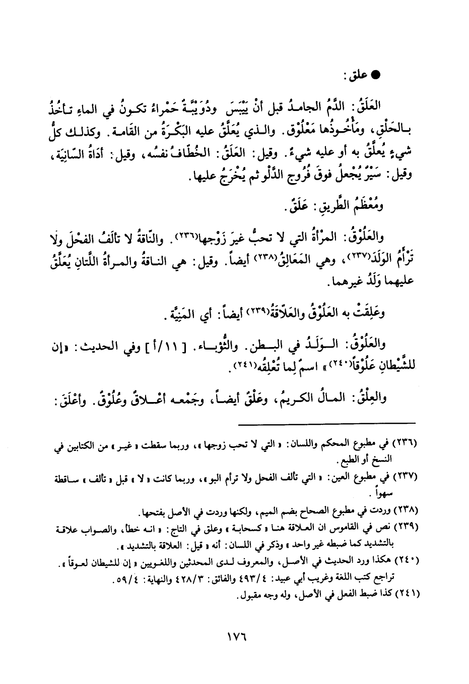 علق العَلَقً : الدمُ الجامدُ قبل أنْ يَيْبَسَ ودُوَيبة حَمْراءُ تكونُ في الماءِ تأخُذُ بالحَلْقِ ، ومأخوذها مَعْلُوْق . والذي يُعلقُ عليه البَكْرَةُ من القَامة . وكذلك كل شيءٍ يُعلقُ به أو عليه شيء . وقيل : العَلَقُ : النطّافُ نفسُه ، وقيل : أدَاةُ السانِيَة ، وقيل : سَيْرٌ يُجْعلُ فوقَ فُروج الدلْو ثم يُخْرَجُ عليها . ومُعْظَمُ الطريقِ : عَلق . والعَلُوْقُ : المرْأةُ التي لا تحبُ غيرَ زَوْجها . والنّاقةُ لا تألَفُ الفحْلَ ولا ترأمُ الوَلَدَ ، وهي المَعَالِقُ أيضاً . وقيل : هي الناقةُ والمرأةُ اللتانِ يُعَلَّقُ عليهما وَلَد غيرهما . وعَلِقَتْ به العَلُوْقُ والعَلاقَةُ أيضاً : أي المَنِية . والعَلُوْقُ : الوَلَدُ في البطن . والثؤباء ، وفي الحديث : ' إن للشيْطانِ عَلُوْقاً ' اسمٌ لِما تُعْلِقه . والعِلْقُ : المالُ الكريمُ ، وعَلْق أيضاً ، وجَمْعه أعْلاقٌ وعُلُوْق . وأعْلَقَ :