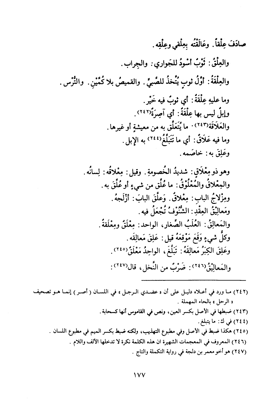صادف علقاً . وعَالَقْتُه بِعِلْقي وعِلقِه . والعِلْقُ : ثَوْبٌ أسْودُ للجَواري : والجِراب . والعِلْقَةُ : أولُ ثوبٍ يُتخذُ للصبي . والقميصُ بلا كُميْنِ . والترْس . وما عليهِ عِلْقَةٌ : أي ثوب فيه خَيْر . وإبل ليس بها عِلْقَةٌ : أي آصِرَةٌ . والعَلاَقَة . ما يُتَعلق به من معيشةٍ أو غيرها . وما فيه عَلاقٌ : أي ما تَتَبعُ به الإبل . وعَلِقَ به : خاصَمه . وهو ذو مِعْلاقٍ : شديدُ الخُصومةِ . وقيل : مِعْلاقُه : لِسانُه . والمِعْلاقُ والمُعْلُوْقُ : ما علَق من شيءٍ أو عُلَقَ به . ومِزْلاجُ البابِ : مِعْلاقٌ . وَعلقَ البابَ : أزْلَجهُ . ومَعالِيْقُ العِقْدِ : الشُنُوْفُ تجْعَلُ فيه . والمَعالِقُ : العُلَبُ الصِّغار ، الواحد : مِعْلَقٌ ومِعْلَقةٌ . وكل شيءٍ وَقَعَ مَوْقِعَهُ قيل : عَلِقَ مَعالِقَه . وعَلِقَ الكِبَرُ مَعالِقَهُ : تَبَلًغَ ، الواحِدُ مَعْلَقٌ . والمَعالِيْقُ : ضَرْبٌ من النَخل ، قال :