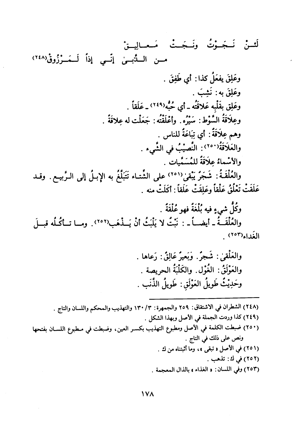لَئن نجَوْتُ ونَجَت معالِيق . . . من الدبى إني إذا ً لَمَرْزُوقْ وعلقَ يفعَل كذا : أي طفِقَ . وعَلِقَ به : نشِبَ . وعَلِق بقَلْبه عَلاقَتُه - أي حبه - عَلَقاً . وعِلاقَةُ السوْط : سَيْرُه . وأعْلَقْتُه : جَعَلْت له عِلاقَةً . وهم علاِقَةٌ : أي تِبَاعَةٌ للناس . والعَلاَقَة : النصيْبُ في الشيء . والأسْماءُ علاقَةٌ للمُسميات . والعُلْقَةُ : شَجَرٌ يَبْقى على الشتاء تَتَبَلَّغُ بها الإبلإلى الربيع . وقد عَلَقَتْ تَعْلُقُ عَلْقاً وعَلِقَتْ عَلَقاً : أكَلتْ منه . وكُلُّ شي فيه بُلْغَةٌ فهو عُلْقَةٌ . والعُلْقَة ُ - أيضاً - : نَبت لا يَلْبَثُ أنْ يَذْهَب . وما تأكُلُه قبلَ الغَداء . والعَلْقى : شَجرٌ . وبَعيرٌ عَالقٌ : رَعاها . والعَوْلَق : الغُوْل . والكَلْبَةُ الحريصة . وحَدِيْث طَويلُ العَوْلَقِ : طَويلُ الذنَب .