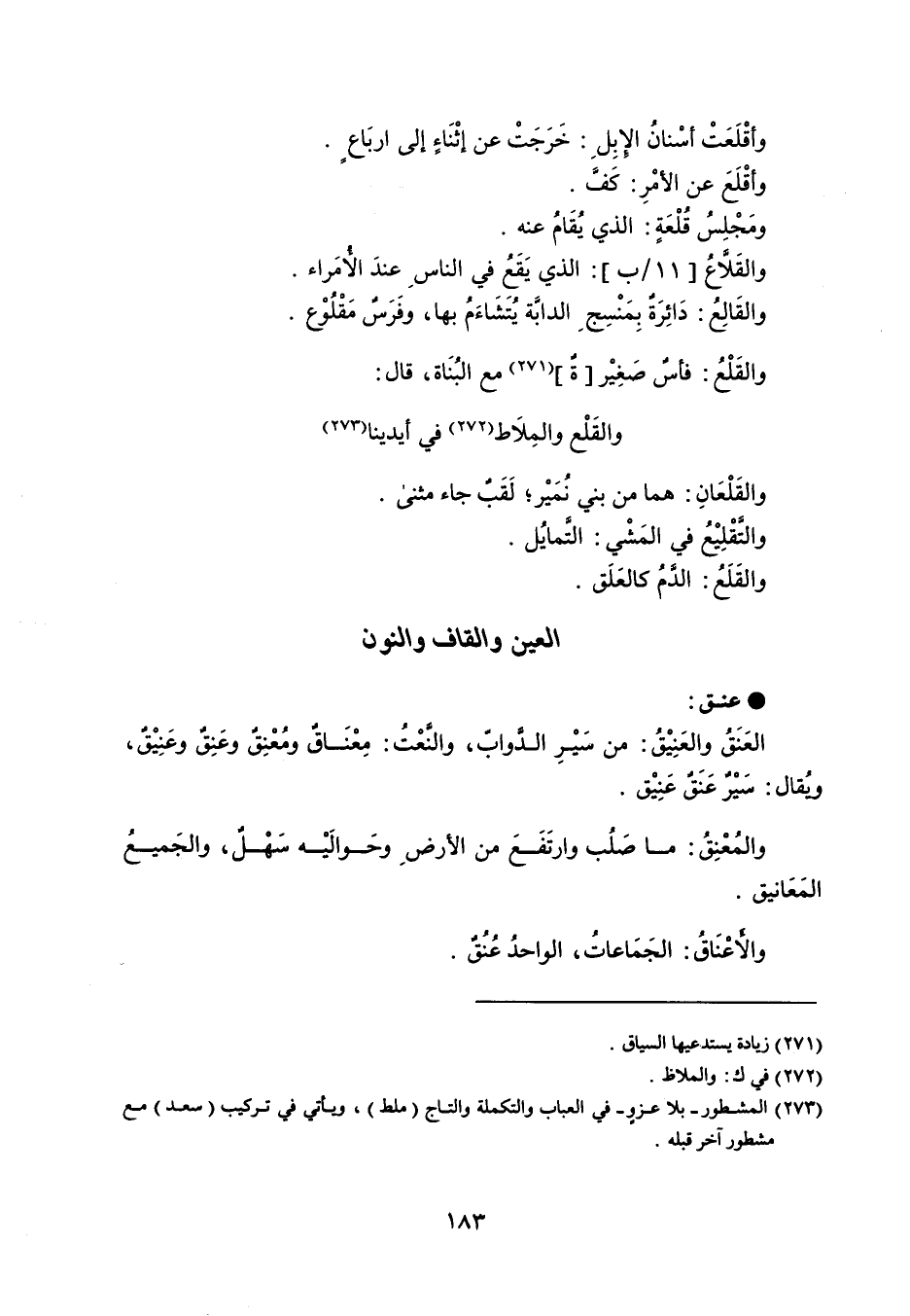 عنق العَنَقُ والعَنِيْقُ : من سَيْرِ الدواب ، والنَّعْتُ : مِعْنَاقٌ ومُعْنِق وعَنِقٌ وعَنِيْقٌ ، ويُقال : سيْر عَنَقٌ عَنِيْق . والمُعْنِقُ : ما صَلُب وارتَفَعَ من الأرض وحَوالَيْه سَهْلٌ ، والجَميعُ المَعَانيق . والاعْنَاقُ : الجَمَاعاتُ ، الواحدُ عُنُق .