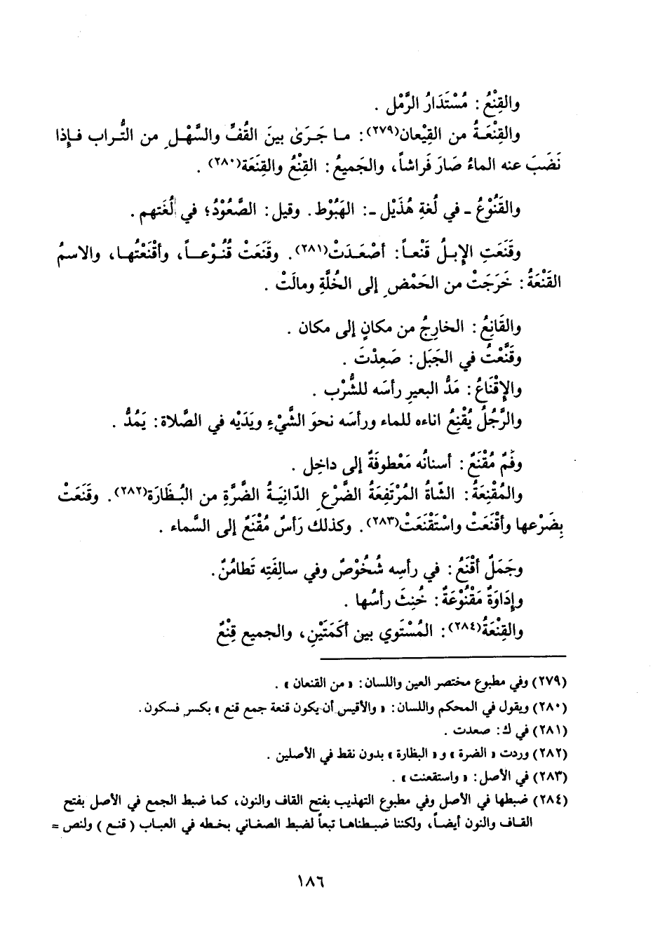 والقِنْعُ : مُسْتَدَارُ الرمْل . والقِنْعَةُ من القِيْعان : ما جَرَى بينَ القًف والسهْل من التراب فإذا نَضَبَ عنه الماءُ صَارَ فَراشاً ، والجَميعُ : القِنْعُ والقِنَعَة . والقَنُوْع ُ - في لًغةِ هُذَيْل - : الهَبُوْط . وقيل : الصعُوْد ؛ في لُغَتهم . وقَنَعَت الإبلقَنْعاً : أصْعَدَتْ وقَنَعَتْ قُنُوْعاً ، وأقْنَعْتُها ، والاسمُ القَنْعَةُ : خَرَجَتْ من الحَمْض إلى الخُلةِ ومالَتْ . والقَانِعُ : الخارِجُ من مكانٍ إلى مكان . وقَنعْتُ في الجَبَل : صَعِدْتَ . والإقْنَاعُ : مَد البعير ِرأسَه للشُّرْب . والرجُلُ يُقْنِعُ اناءه للماء ورأسَه نحوَ الشيْءِ ويَدَيْه في الصلاة : يَمُدُّ . وفم مُقْنَع : أسنانُه معْطوفَةٌ إلى داخِل . والمُقْنِعَةُ : الشاةُ المُرْتَفِعَةُ الضرْع الدانِيَة الضرةِ من البُظَارَة بِضَرْعها وأقْنَعَتْ واسْتَقْنَعَتْ . وكذلك رَأسٌ مقنع إلى السماء . وجَمَلٌ أقْنَعُ : في رأسِه شُخُوْصٌ وفي سالفَتِه تَطامُنٌ . وإدَاوَةٌ مَقْنُوْعَةٌ : خُنِثَ رأسُها . والقِنْعَةُ : المُسْتَوي بين كَمَتَيْنِ ، والجميع قِنْع .