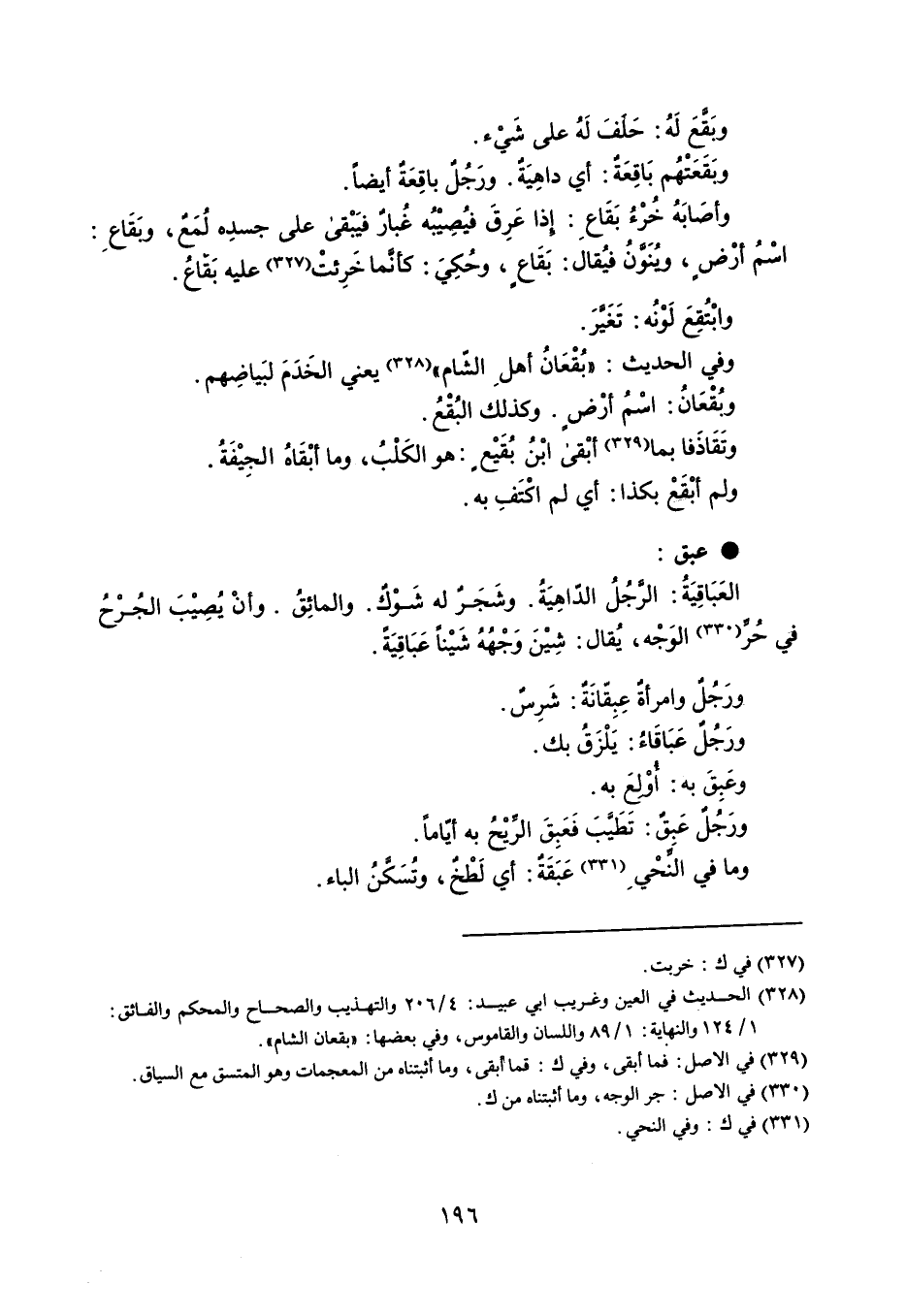 وبَقعَ لَهُ : حَلفَ لَهُ على شَيْء . وبَقَعَتهُم بَاقِعَة : أي داهيَة . ورَجُل باقِعَةٌ أيضاً . وأصَابَهُ خُرْءُ بَقَاع : إذا عَرِقَ فيُصِيْبُه غُبارٌ فيَبْقى على جسمِه لُمع ، وبَقَاع : اسْمُ أرض ، ويُنَونُ فيُقال : بَقَاع ، وحُكِيَ : كأنما خَيرتْ عليه بَقاع . وابتقِعَ لوْنُه : تَغيرَ . وفي الحديث : بُقْعَانُ أهل الشّام يعني الخَدَمَ لبَياضِهم . وبُقْعَانُ : اسْمُ أرْض . وكذلك البُقْعُ . وتَقَاذفا بما أبْقى ابْنُ بُقَيْع : هو الكَلْبُ ، وما أبْقَاهُ الجِيْفَة . ولم أبْقَعْ بكذا : أي لم اكْتَفِ به . عبق العَبَاقِيَةُ : الرجُلُ الدّاهِيَةُ . وشَجَر له شَوْك . والمائِقُ . وأنْ يُصِيْبَ المجرْحُ في حُر الوَجْه ، يُقال : شِيْنَ وَجْهُهُ شَيْناً عَبَاقِيَةً . ورَجُلٌ وامرأةٌ عِبِقانَة : شَرِسٌ . ورَجُلٌ عَبَاقَاءُ : يَلْزَقُ بك . وعَبِقَ به : اوْلعَ به . ورَجلٌ عَبقٌ : تَطيب فَعَبِقَ الريْحُ به أياماً . وما في الَنحْي عَبَقَةٌ : أي لَطْخُ ، وتُسَكنُ الباء .