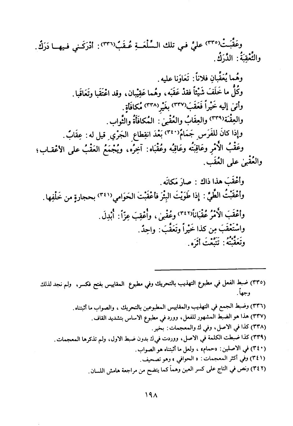 وعَقبَتْ علي في تلك السلْعَةِ عُقَب : أدْرَكَني فيها دَرك . والتُعْقِبَة : الدركُ . وهُما يُعَقبانِ فلاناً : تَعَاوَنا عليه . وكُل ما خَلَفَ شَيْئاً فقدْ عَقَبَه ، وهُما غقِيْبان ، وقد اعْتقَبا وتَعَاقَبا . وأتى إليه خَيْراً فَعَقب بغيَر مُكافَأةٍ . والعقبَة والعِقَاب والعقْبى : المُكافَأَةُ والثواب . وإِذا كانَ للفَرس جَمَام بعدَ انقِطاع الجَرْي قيل له : عِقَاب . وعَقب الأمْرِ وعَاقِبَتُه وعَاقِبُه وعُقْبَاه : آخِرُه ، وجمَعُ العَقْب على الأعْقاب ؛ والعُقْبى على العُقب . وأعْقَبَ هذا ذاك : صارَ مَكانَه . وأعْقَبْت الطي : إذا طويْتَ البئْر فأعْقَبْتَ الحَوَامى بججارة من خَلْفِها . وأعْقَبَ الأمر عقْبَاناً وعُقْبى ، واعْقِبَ عِزاً : أبدل . واسْتَعْقَبَ مِن كذا خَيْراً وتعقبَ : واحِدٌ . وتَعَقبْتُهُ : تَتبعْتَ أثَرَه .