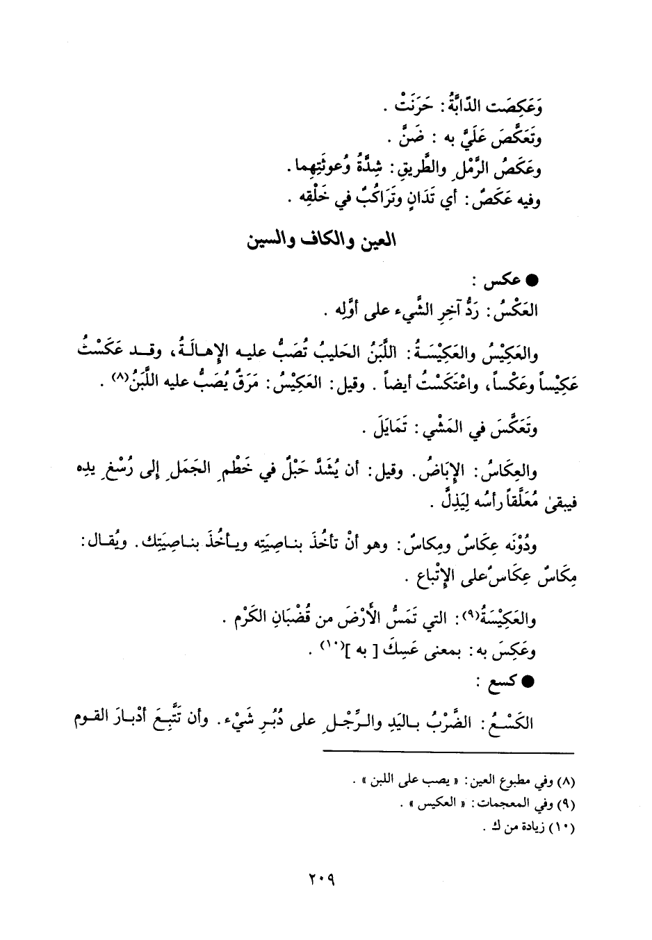 عكس العَكْسُ : رد آخِرِ الشيء على أوله . والعَكِيْسُ والعَكِيْسَةُ : اللبَنُ الحَليبُ تُصَب عليه الإهالَةُ ، وقد عَكَسْتُ عَكِيْساً وعَكْساً ، واعْتَكَسْتُ أيضاً . وقيل : العَكِيْسُ : مَرَن يُصَبُّ عليه اللبَنُ . وتَعَكسَ في المَشْي : تَمَايَلَ . والعكَاسُ : الإبَاضُ . وقيل : أن يُشَد حَبْل في خَطْم الجَمَل إلى رسغ يدِه فيبقى مُعًلَقاً رأسُه لِيَذل . ودوْنَه عِكَاس ومِكاسٌ : وهو أنْ تأخُذَ بناصِيَته ويأخُذَ بناصِيَتِك . ويُقال : مِكَاسٌ عِكَاس على الإِتْباع . والعَكِيْسَةُ : التي تَمس الأرْضَ من قُضْبَانِ الكَرْم . وعَكِسَ به : بمعنى عسكَ به . كسع الكَسْعُ : الضَرْبُ باليَدِ والرجْل على دُبُرِ شَيْء . وأن تَتبِعَ أدْبارَ القوم
