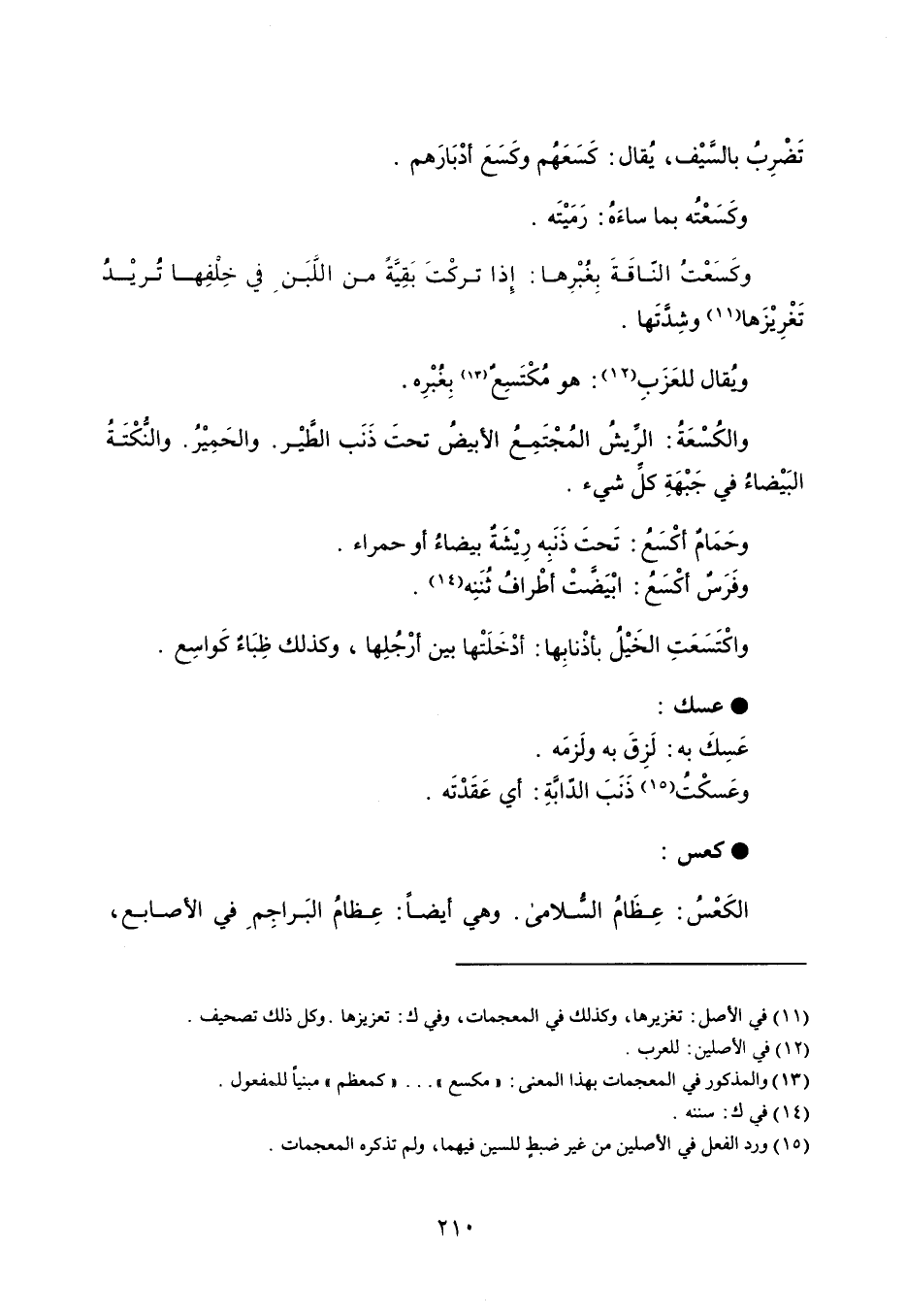 تَضْرِبُ بالسيْف ، يُقال : كَسَعَهُم وكَسَعَ أدْبَارَهم . وكَسَعْتُه بما ساءهُ : رَمَيْتَه . وكَسَعْتُ النّاقَةَ بِغُبْرِها : إِذا تركْت بَقِيًةً من اللًبَن في خِلفِها تُريْدُ تَعزيْزَها وشِدَتَها . ويُقال للعَزَبِ : هو مُكْتَسِعٌ بِغُبْرِه . والكُسْعَةُ : الريشُ المجْتَمِعُ الأبيضُ تحتَ ذَنَب الطيْر . والحَمِيْرُ . والنُكْتَةُ البَيْضاء ُفي جَبْهَةِ كل شيء . وحَمَائم أكْسَعُ : تَحتَ ذَنَبِه رِيْشَةٌ بيضاءُ أو حمراء . وفَرَسٌ أكْسَعُ : ابْيَضَّتْ أطْرافُ ثُنَنِه . واكْتَسَعَتِ الخَيْلُ بأذْنابِها : أدْخَلَتْها بين أرْجلِها ، وكذلك ظِبَاءٌ كَواسِع . عسك عَسكَ به : لَزِقَ به ولَزمَه . وعَسكْتُ ذَنَبَ الدّابًةِ : أي عَقَدْتَه . كعس الكَعْسُ : عِظَامُ السلامى . وهي أيضاً : عِظامُ البَراجِم في الأصابع ،