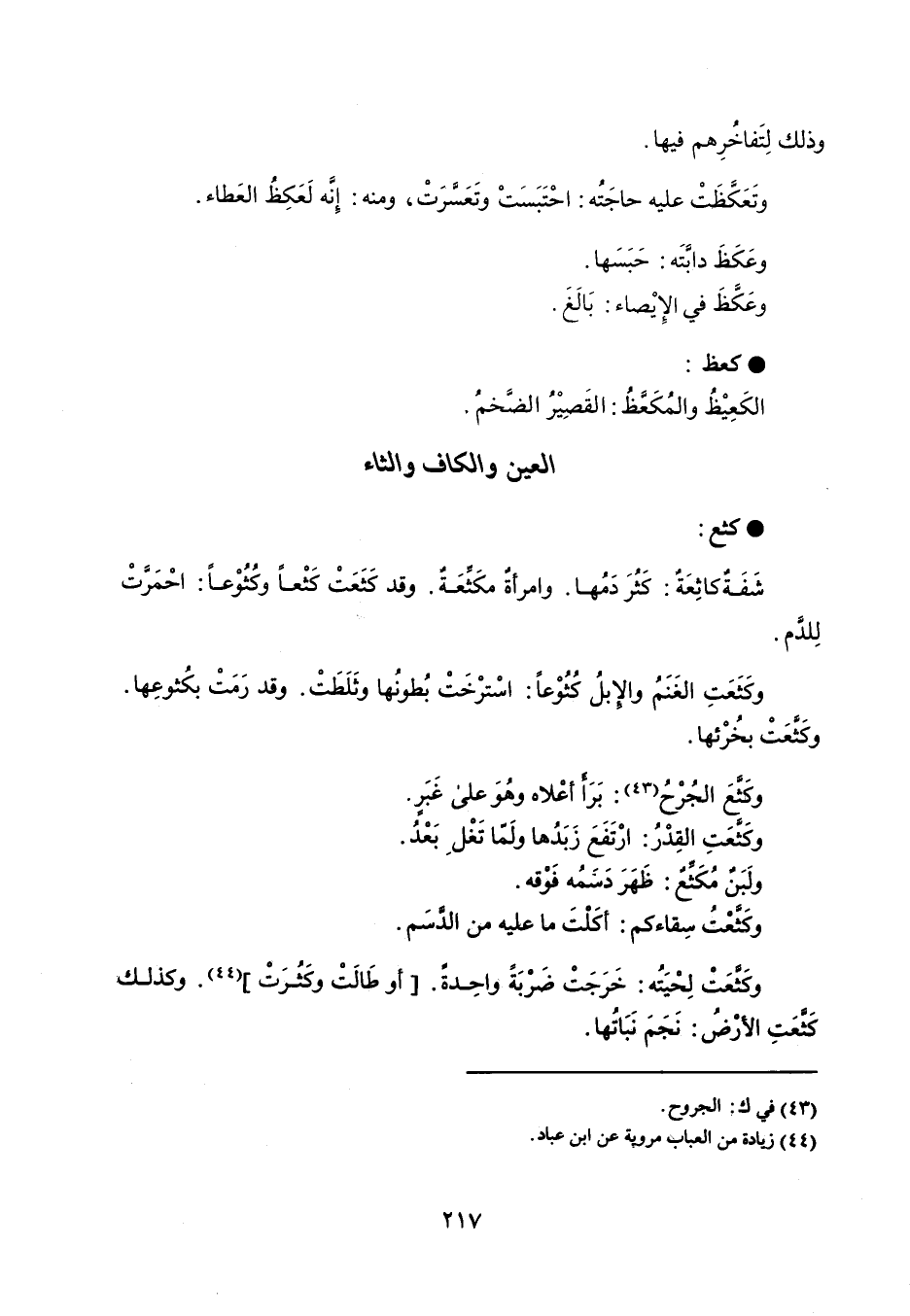كثع شَفَةٌ كاثِعَةٌ : كَثُرَ لحمُها . وامرأةٌ مكثعَةٌ . وقد كَثَعَتْ كَثْعاً وكُثُوْعاً : احْمَرتْ وكَثَعَتِ الغَنَمُ والإبلُ كُثُوْعاً : اسْترْخَتْ بُطونُها وثَلَطَتْ . وقد رَمَتْ بكُثوعِها . وكَثعَتْ بخُرْئها . وكَثعَ الجُرْحُ : بَرأ أعْلاه وهُو َعلى غَبَرٍ . وكَثعَتِ القِدْرُ : ارْتَفَعَ زَبَدُها ولما تَغْل بَعْدُ . ولَبَنٌ مُكَثًع : ظَهَر َدسَمُه فَوْقه . وكَثعتُ سِقاءكم : كَلْتَ ما عليه من الدسم . وكَثعَتْ لِحْيَتُه : خَرَجَتْ ضَرْبَةً واحِدةً . و طَالَتْ وكَثرَتْ ، كَثعَتِ الأرضُ : نجَمَ نبَاتُها .