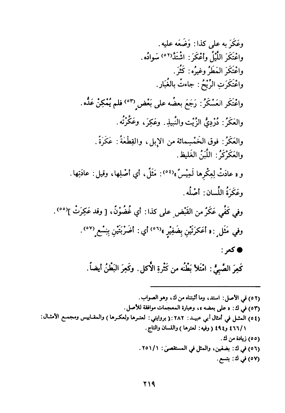 وعَكَر َبه على كذا : وَضَعَه عليه . واعْتَكَرَ اللَّيْلُ وأعْكَرَ : اشْتد سَواده . واعْتَكَرَ المَطَرُ وغيرُه : كَثُرَ . واعْتَكَرَتِ الرِّيْحُ : جاءتْ بالغُبَار . واعْتَكَر العَسْكَرُ : رَجَعَ بعضُه على بَعْض فلم يُمْكِنْ عَده . والعَكَرُ : دُرْدِي الزَيْت والنَبيذِ . وعَكِرَ ، وعًكرْتُه . والعَكَرُ : فوق الخَمْسِمائة من الإِبل ، والقِطْعَةُ : عَكَرَةٌ . والعَكَرْكَرُ : اللبَنُ الغَليظ . و ' عادَتْ لِعِكْرِها لَمِيْسٌ ' : مَثَلٌ ، أي أصْلِها ، وقيل : عادَتِها . وعَكرَةُ اللسان : أصْلُه . وفي كَفي عَكَر من القَبْض على كذا : أي غُضُوْنٌ ، وقد عَكِرَتْ . وفي مَثَل : أعَكرَتَيْنِ بِضَفِيْرٍ ، أي : أضَرْبَتَيْن بِنِسْع . كعر كَعِرَ الصبي : امتلأ بَطْنُه من كثْرةِ أكل . وكَعرَ البَطْنُ أيضاً .