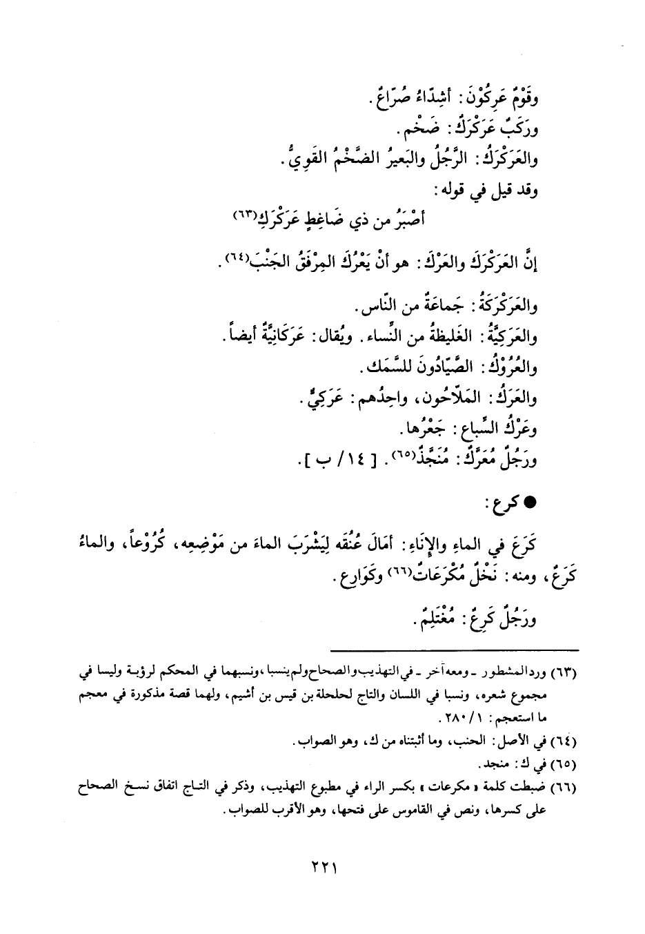 وقَوم عَرِكُوْنَ : أشداءُ صُراعٌ . ورَكب عَرَكْرَكٌ : ضَخْم . والعَرَكْرَكُ : الرَّجُلُ والبَعيرُ الضَّخْمُ القَوِيُ . وقد قيل في قوله : أصْبَرُ من ذي ضَاغِطٍ عَرَكْرَكِ إن العَرَكْرَكَ والعَرْكَ : هو أن يَعْرُكَ المِرْفَقُ الجَنْبَ . والعَرَكْرَكَةُ : جَماعَةٌ من الناس . والعَرَكِيةُ : الغَليظةُ من النساء . ويُقال : عَرَكَانية أيضاً . والعُرُوْكُ : الصيادُونَ للسمَك . والعَرَكُ : الملاحُون ، واحِدهم : عَرَكِي . وعَرْكُ السباع : جَعْرُها . ورَجُلٌ مُعَرك : مُنَجذٌ . كرع كَرَعَ في الماءِ والإنَاءِ : أمَالَ عُنُقَه لِيَشْربَ الماءَ من مَوْضِعِه ، كُرُوْعاً ، والماءُ كَرَع ، ومنه : نَخْلٌ مُكْرَعَاتٌ وكَوَارع . ورَجل كَرِعٌ : مُغْتَلِمٌ .