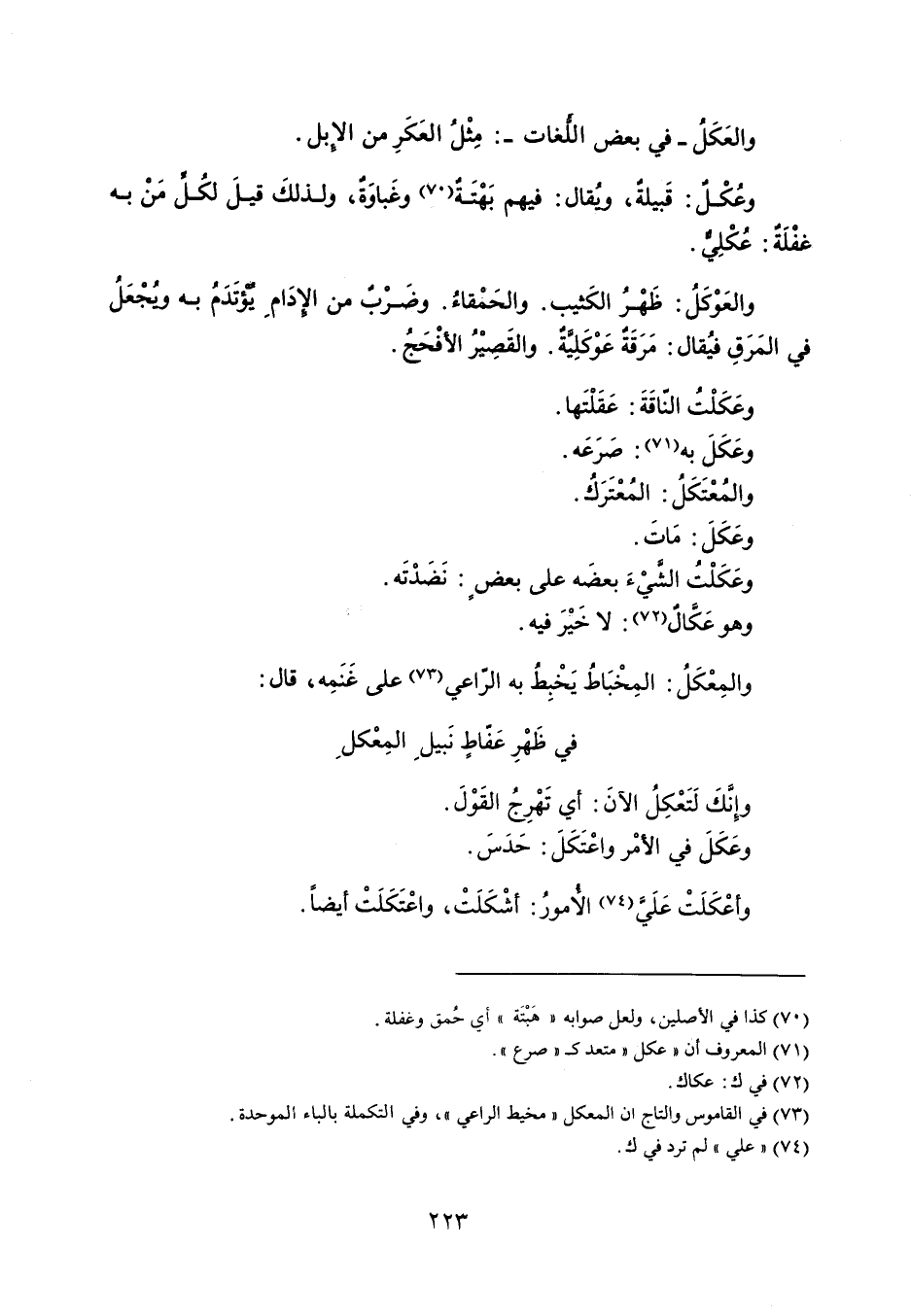 والعَكَل ُ - في بعض اللغات - : مِثْلُ العَكَر ِمن الإبل . وعُكلٌ : قَبيلةٌ ، ويُقال : فيهم بهتَة وغَباوَة ، ولذلكَ قيلَ لكُلً مَنْ به غفلَةٌ : عُكْلِي . والعَوْكَلُ : ظَهْر الكثيب . والحَمْقاءُ . وضرب من الإدَام ِ - يؤتدَمُ به ويُجْعَلُ في المَرَقِ فيُقال : مَرَقَة عَوْكَلِية . والقَصِيْرُ الأقْحَجُ . وعَكَلْتُ الناقَةَ : عَقَلْتَها . وعَكَلَ به : صَرَعَه . والمُعْتَكَلُ : المُعْتَرَكُ . وعَكَلَ : مَاتَ . وعَكَلْتُ الشيْء َبعضَه على بعض : نَضَدْتَه . وهو عَكال : لا خَيْرَ فيه . والمِعْكَلُ : المِخْبَاطُ يَخْبِطُ به الراعي على غَنَمِه ، قال : في ظَهْر ِعَفاطٍ نَبيل المِعْكل وإنكَ لَتَعْكِلُ الآنَ : أي تَهْرِجُ القَوْلَ . وعَكَلَ في الأمْر واعْتَكَلَ : حَدَسَ . وأعْكَلَتْ عَلَيَّ الأمورُ : أشْكَلَتْ ، واعْتَكَلَتْ أيضاً .