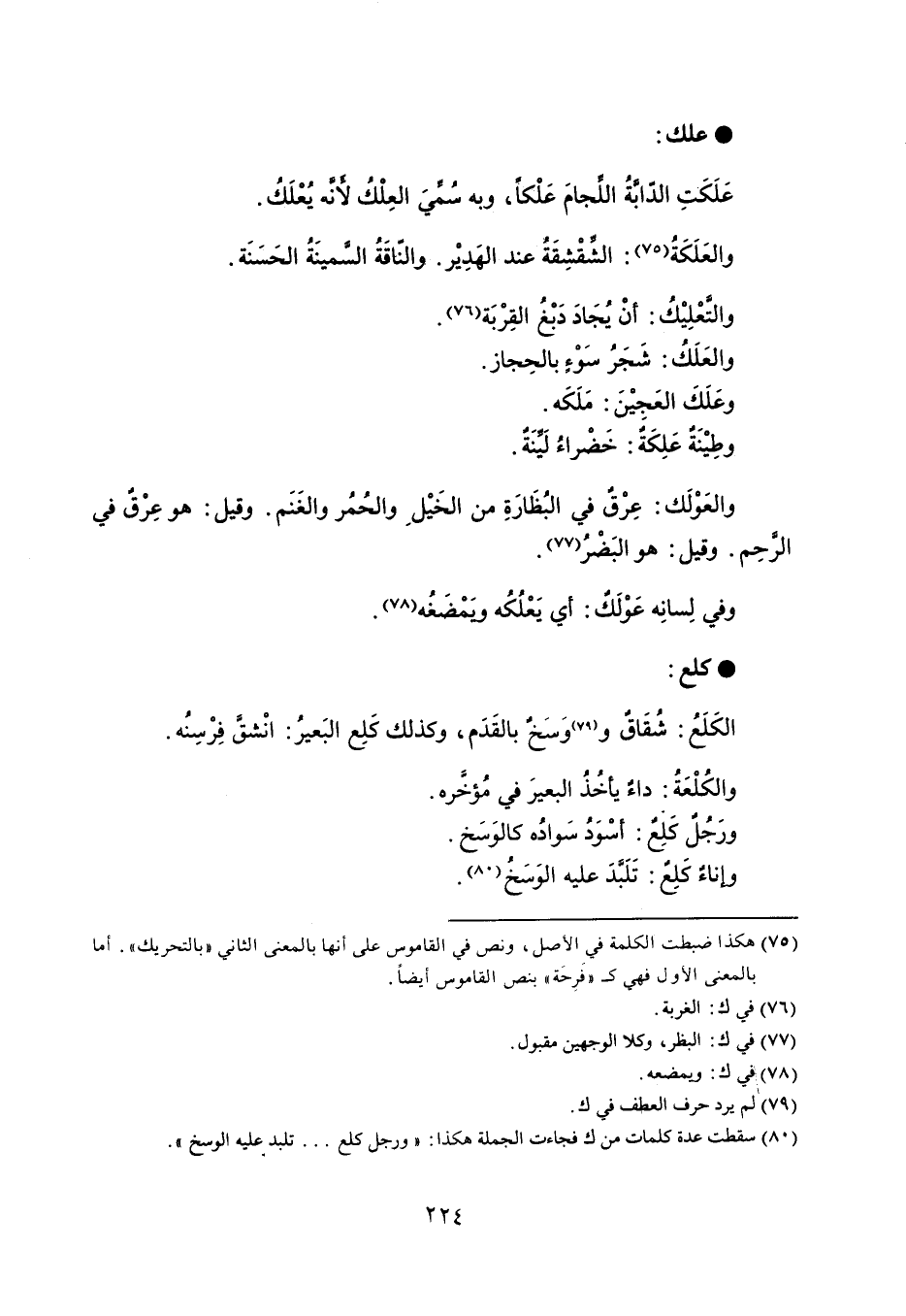 علك عَلَكَتِ الدابةُ اللجامَ عَلْكاً ، وبه سُميَ العِلْكُ لأنه يُعلَك . والعَلَكَةُ : الشقْشِقَةُ عند الهَدِيْر . والناقَةُ السمينَةُ الحَسَنَة . والتعْلِيْكُ : أنْ يُجادَ دَبْغُ القِرْبَة . والعَلَكُ : شَجَرُ سَوْء بالحِجاز . وعَلَكَ العَجِيْنَ : مَلَكَه . وطِيْنَة عَلِكَةٌ : خَضْراءُ لينَةٌ . والعَوْلك : عِرْق في البُظَارَةِ من الخَيْل والحُمُر والغنَم . وقيل : هو عِرْقٌ في الرحِم . وقيل : هو البَضْرُ . وفي لِسانِه عَوْلَكٌ : أي يَعْلُكُه ويَمْضَغُه . كلع الكَلَعُ : شُقَاقٌ ووَسَخٌ بالقَدَم ، وكذلك كَلِع البَعيرُ : انْشق فِرْسِنُه . والكُلْعَةُ : داء يأخذُ البعيرَ في مُؤخَره . ورَجُلٌ كَلِعٌ : أسْوَدُ سَواده كالوَسَخ . وإناءٌ كَلِعٌ : تَلبدَ عليه الوَسَخُ .