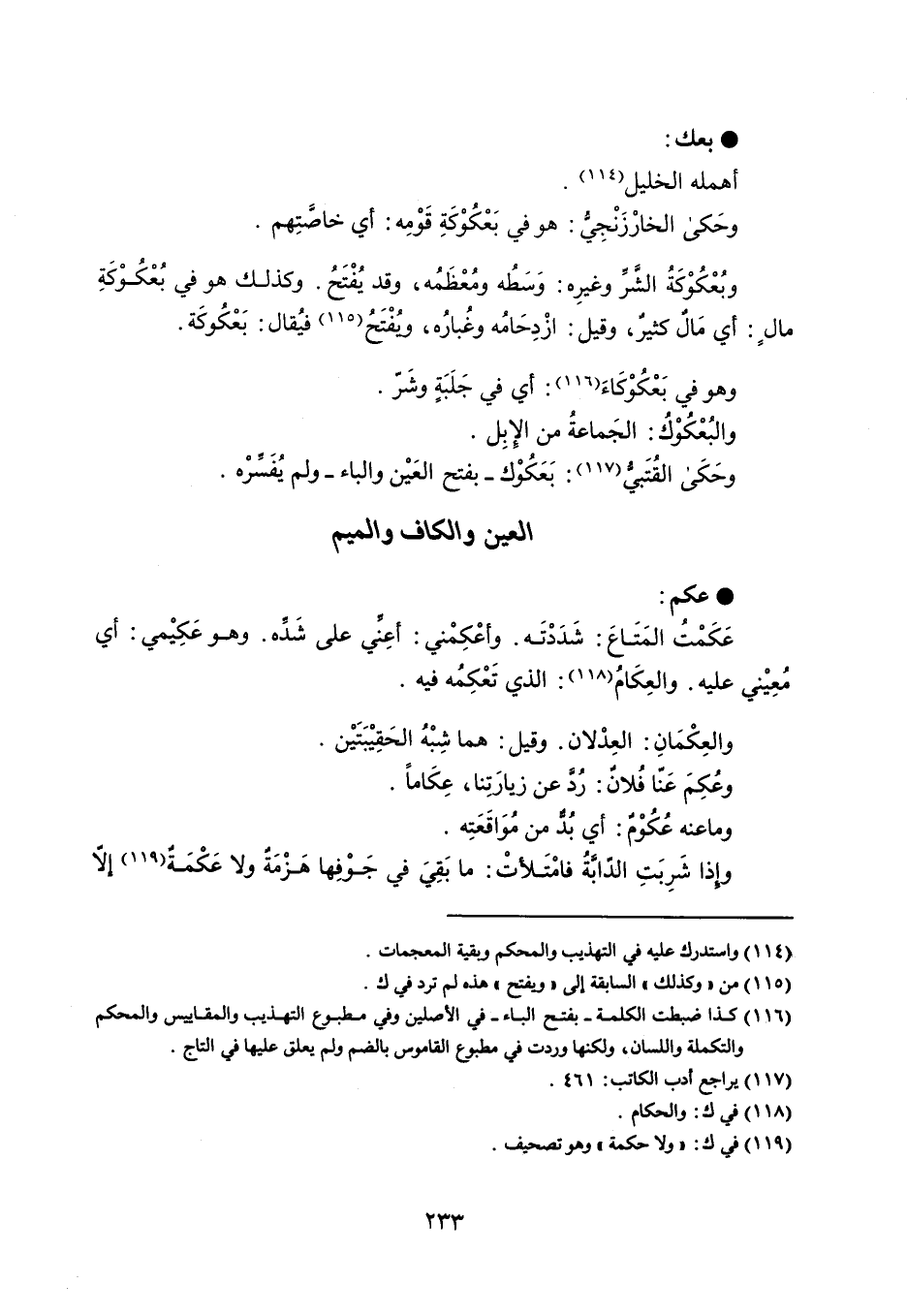 بعك أهمه الخليل . وحَكى الخارْزَنْجِيُّ : هو في بَعْكُوْكَةِ قَوْمِه : أي خاصَتِهم . وبُعْكُوْكَةُ الشَرّ ِوغيرِه : وَسَطُه ومُعْظَمُه ، وقد يُفْتَحُ . وكذلك هو في بعكوكة مالٍ : أي مَال كثيرٌ ، وقيل : ازْدِحَامُه وغُبارُه ، ويُفْتَحُ فيُقال : بَعْكُوكَة . وهو في بَعْكُوْكَاءَ : أي في جَلَبَةٍ وشَرّ . والبُعْكُوْكُ : الجَماعةُ من الإِبِل . وحَكَى القُتَبيُّ : بَعَكُوْك - بفتح العَيْن والباء - ولم يُفَسًرْه .
