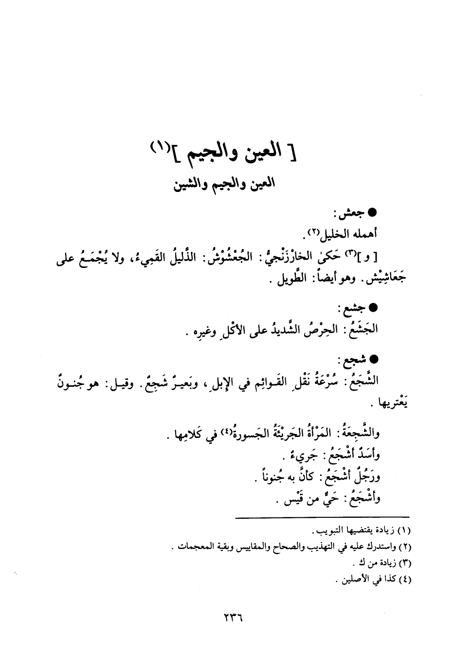 جعش : أهمله الخليل . وحَكى الخارْزَنْجي : الجُعْشُوْش : الذليلُ القَمِيءُ ، ولا يُجْمَعُ على تجعَاشِيْش . وهو أيضاً : الطويل . جشع الجَشَعُ : الحِرْصُ الشديدُ على الأكْل وغيرِه . شجع الشًجَعُ : سُرْعَةُ نَقْل القَوائِم في الإبل ، وبَعير شَجِع . وقيل : هو جُنون يَعْتريها . والشًجِعَةُ : المَرْأةُ الجَريْئَةُ الجَسورةُ في كَلامِها . وأسَدٌ أشْجَعُ : جَريءٌ . ورَجُلٌ أشْجَعُ : كأنَ به جُنوناً . وأشْجَعُ : حَي من قَيْس .