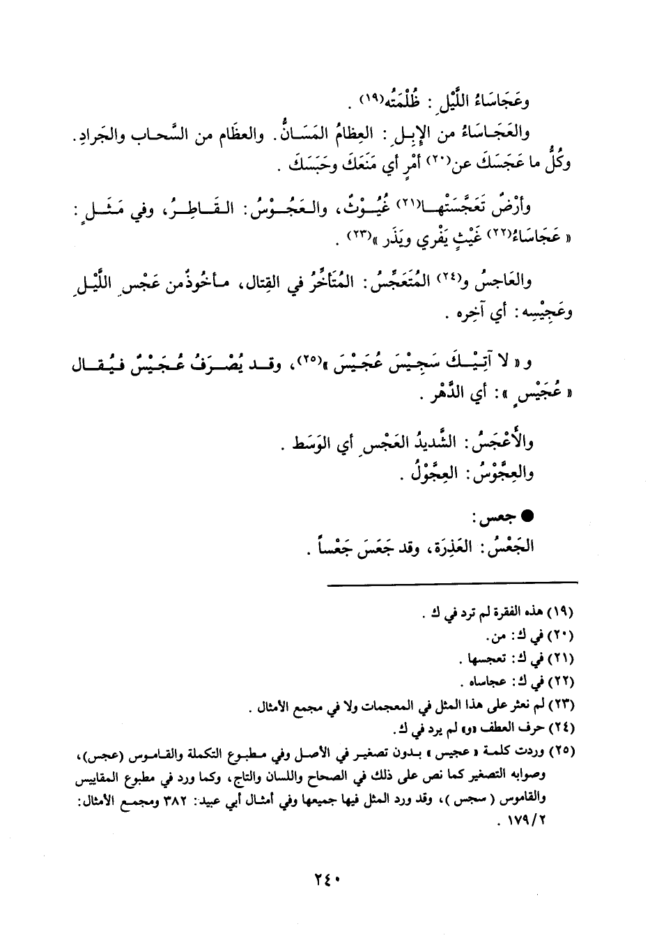 وعَجَاسَاءُ الليْل : ظُلْمَتُه . والعَجَاسَاءُ من الإبِل : العِظامُ المَسَان . والعظَام من السَّحاب والجَرادِ . وكُلُّ ما عَجَسَكَ عن أمْرٍ أي مَنَعَكَ وحَبَسَكَ . وأرْضٌ تَعَجًسَتْها غُيُوْثٌ ، والعجُوْسُ : القَاطِرُ ، وفي مَثَلٍ : ' عَجَاسَاءُ غَيْثٍ يَفْري ويَذَر ' . والعَاجسُ و المُتَعجسُ : المُتَأخرُ في القِتال ، مأخُوذٌ من عَجْس اللَّيْل وعَجِيْسِه : أي آخِره . ولا آتِيْكَ سَجِيْسَ عُجَيْسَ ، وقد يصرَفُ عُجَيسٌ فيُقال عُجَيْس : أي الدهْر . والاعْجَس : الشديدُ العَجْس أي الوَسَط . والعِجَّوْسُ : العَجّوْلُ . جعس الجَعْسُ : العَذِرَة ، وقد تجعَسَ جَعْساً .