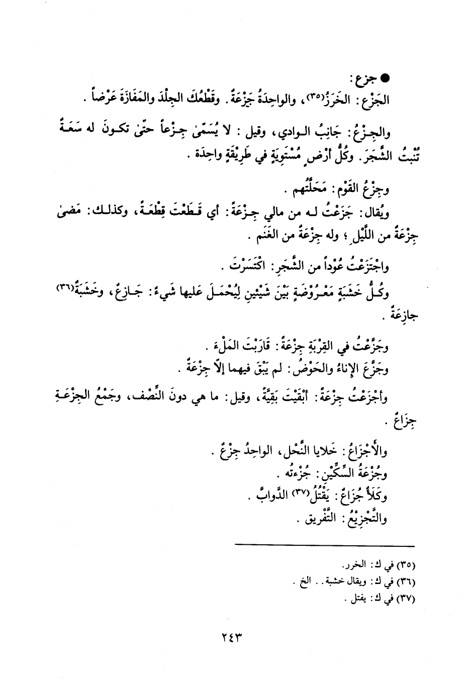 جزع الجَزْع : الخَرَزُ ، والواحدَةُ جزعةٌ . وقطعُك الجِلْدَ والمَفَازَةَ عرضاً . والجِزْعُ : جَانِبُ الواعي ، وقيل : لا يُسمى جِزْعاً حتى تكونَ له سَعَة تنبتُ الشجَرَ . وكُل أرْض مُسْتَوِيةٍ في طَرِيْقَة واحِدَة . وجزْع القَوْم : مَحلتُهم . ويُقال : جَزَعْتُ له من مالي جِزْعَةً : أي قَطَعْت قِطعَةً ، وكذلك : قضى جِزْعَةٌ من الليْل ؛ وله جِزْعَةٌ من الغَنَم . واجْتَزَعْتُ عُوْداً من الشَّجَرِ : اكْتَسَرْتَ . وكُل خَشَبَةٍ مَعْرُوْضَةٍ بَيْنَ شَيْئينِ لِيُحْمَلَ عَليها شَيء : جَازع ، وخَشَبَة جازِعَةٌ . وجَزعْتُ في القِرْبَةِ جِزْعَةً : قَارَبْتَ المَلْءَ . وجَزعَ الإناءُ والحَوْضُ : لم يَبْقَ فيهما إلا جِزْعَة . وأجْزَعْتُ جِزْعَةً : أبْقَيْتَ بَقيةً ، وقيل : ما هي دونَ النصْف ، وجَمْعُ الجِزْعَةِ جِزَاعٌ . والأجْزَاعُ : خَلايا النحْل ، الواحِدُ جِزْعٌ . وجُزْعَةُ السكيْنِ : جُزءتُه . وكلأٌ جُزَاع : يَقْتُلُ الدوابً . والتَّجْزِيْعُ : التَفْريق .
