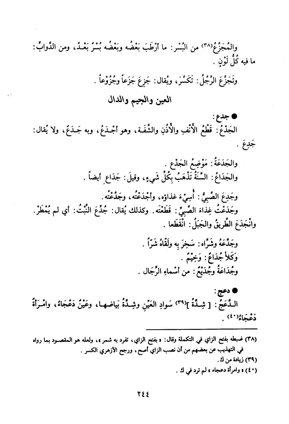 جدع الجَدْع : قَطْعُ الأنْفِ والاذُنِ والشَّفَهَ ، وهو أجْدَعُ ، وبه جَدَع ، ولا يُقال : جَدِعَ . والجَدَعَةُ : مَوْضِعُ الجَدْع . والجَدَاعُ : السنَةُ تَذْهَبُ بِكُل شَيءٍ ، وقيلَ : جَدَاع أيضاً . وجَدِع الصَبي : اسِيْءَ غذاؤه ، وأجْدَعْتُه ، وجَدًعْته . وجَدَعْتُ غِذاءَ الصبِي : قَطَعْتَه . وكذلك يُقال : جُذعَ النَّبْتُ : أي لم يُمْطَرْ . وانْجدَع الطريقُ والجَبلُ : انْقَطَعا . وجدعَهُ وشَراه : سَخِرَ بِه ولَقاهُ شَراً . وَكلأ جدَاع : وَخِيم . وجُدَاعَةُ وجُدَع : من أسْماءِ الرجَال . دعج الدعَجُ : شدة سَوادِ العينِ وشِدة بَياضها ، وعين دَعجَاءُ ، وامرَأة دَعْجَاءُ .