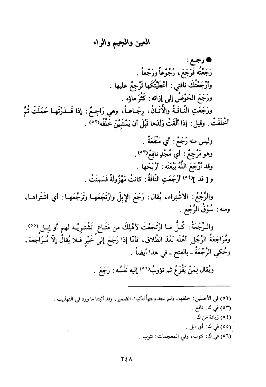 رجعِ رَجَعتُه فرَجَعَ ، رُجًوْعاً ورَجْعاً . وأرجعتُكَ ناقتي : أعْطَيْتُكَها تَرْجع عليها . ورَجَعَ الحوضُ إلى ازائه : كَثُرَ ماؤه . ورَجَعَتِ الناقَةُ والأتَانُ ، رِجَاعاً ، وهي رَاجِعٌ : إذا قدرتَها حَمَلَت ثُم أخْلَفَت . وقيل : إِذا ألْقَتْ وَلَداً قَبْلَ أن يَسْتَبِيْنَ خَلْقُه . وليس منه رَجْعٌ : أي مَنْفَعَة . وهو مَرْجع : أي مُجْدٍ نافِعٌ . وقد أرْجَعَ اللهُ بَيْعَتَه : أرْبَحَها . وقد أرْجَعَتِ الناقَةُ : كانتْ مَهْزُولَةً فَسَمِنَتْ . والرجْعُ : الافْتِراء ، يُقال : رَجَع الإبلوارْتَجَعَها وتَرَجعَها : أي اشْتَراها ، ومنه : سُوْقُ الرَّجْع . والرجْعَةُ : كُل ما ارْتَجَعْتَ لأهْلِكَ من مَتَاع تَشْتَرِيْه لهم أو إبِلٍ . ومُرَاجَعَةُ الرجُل أهْلَه بَعْدَ الطَلاق ، فأمّا إذا رَجَعَ إلى خَيْرٍ فلا يُقالُ إلا مُرَاجَعَة ، وحُكي الرجْعَةُ - بالفتح - في هذا أيضاً . ويُقال لِمَنْ يَفْزَعُ ثم تؤوبُ إليه نَفْسُه : رَجَعَ .