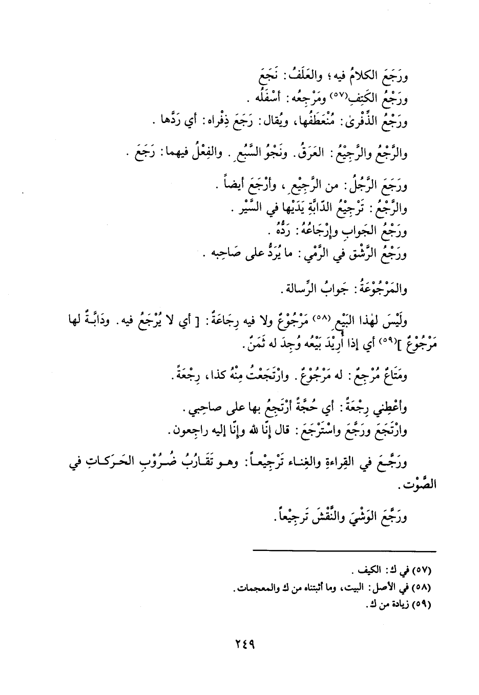 ورجع الكلام فيه ؛ والعلف : نجع . ورجع الكَتِف ومَرْجعُه : أسْفَلُه . ورَجْعُ الذَفْرى : مُنْعَطَفُها ، ويُقال : رَجَعَ ذِفْراه : أي رَدًها . والرجْع والرَّجِيْعُ : العَرَقُ . ونَجْوُ السَّبُع . والفِعْلُ فيهما : رَجَعَ . ورجعَ الرجُلُ : من الرجِيْع ، وأرْجَعَ أيضاً . والرجْعُ : تَرْجِيْعُ الدّابةِ يَدَيْها في السَّيْر . ورَجْعُ الجَوابِ وإرْجَاعُهُ : ردُهُ . ورجع الرشق في الرمي : ما يُرد على صَاحبه . والمَرْجُوْعَةُ : جَوابُ الرِّسالة . ولَيْسَ لهذا البَيعِ مَرْجُوْعٌ ولا فيه رِجَاعَة : أي لا يُرْجَعُ فيه . ودَابَّةٌ لها رجُوْعٌ ، أي إذا أرِيْدَ بَيْعُه وُجِدَ له ثَمَن . ومَتَاع مُرْجِعٌ : له مَرْجُوْعٌ . وارْتَجَعْتُ مِنْهُ كذا ، رِجْعَةً . وأعْطِني رِجْعَةً : أي حُجةً أرْتَجِعُ بها على صاحِبي . وارْتَجَعَ ورجعَ واسْتَرْجَعَ : قال إِنا لله وإنّا إليه راجِعون . ورجعَ في القِراءةِ والغِناء تَرْجِيْعاً : وهو تَقَارُبُ ضُرُوْبِ الحَرَكات في الصوت . ورَجعَ الوَشْيَ والنقْشَ تَرجِيْعاً .