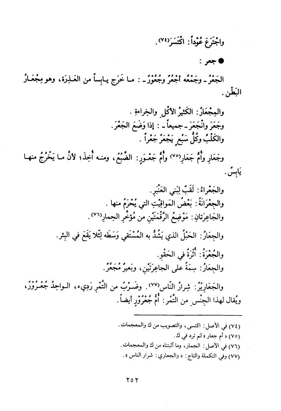 واجترَعَ عوداً : اكتسر . جعر الجعْرُ - وجَمْعُه أجعرٌ وجُعور - : ما خَرَج يابِساً من العذِرَة ، وهو مِجْعَارُ البَطْن . والمجْعَارُ : الكَثيرُ الأكْل والخِراءةِ . وجَعَرَ وانجَعرَ - جميعاً - : إذا وَضَعَ الجَعْرَ . والكلْبُ وكُل سَبُع يَجْعَر جَعْراً . وجَعَارِ وأم جَعَار وأم جَعْوَرٍ : الضبُعُ ، ومنه أخِذَ ؛ لأن ما يخْرُجُ منها يَابِسٌ . والجَعْراءُ : لَقَبٌ لِبَني العَنْبَرِ . والجِعْرَانَةُ : بَعْضُ المَواقِيْتِ التي يُحْرَمُ منها . والجَاعِرَتانِ : مَوْضِعُ الرقْمَتَيْنِ من مُؤخرِ الحِمارِ . والجِعَارُ : الحَبْلُ الذي يَشُدُّ به المُسْتَقي وَسَطَه لِئلا يَقَعَ في البِئر . والجُعْرَةُ : اثْرَةٌ في الحَقْوِ . والجِعَارُ : سِمَةٌ على الجاعِرَتَيْنِ ، وبَعير مُجعَر . والجَعَارِيْرُ : شِرارُ النّاس . وضَرْبٌ من التَمْرِ ردِيء ، الواحِدُ جُعْروْرٌ ، ويُقال لهذا الجِنْس من التَّمْر : امُّ جُعْرُوْرٍ أيضاً .