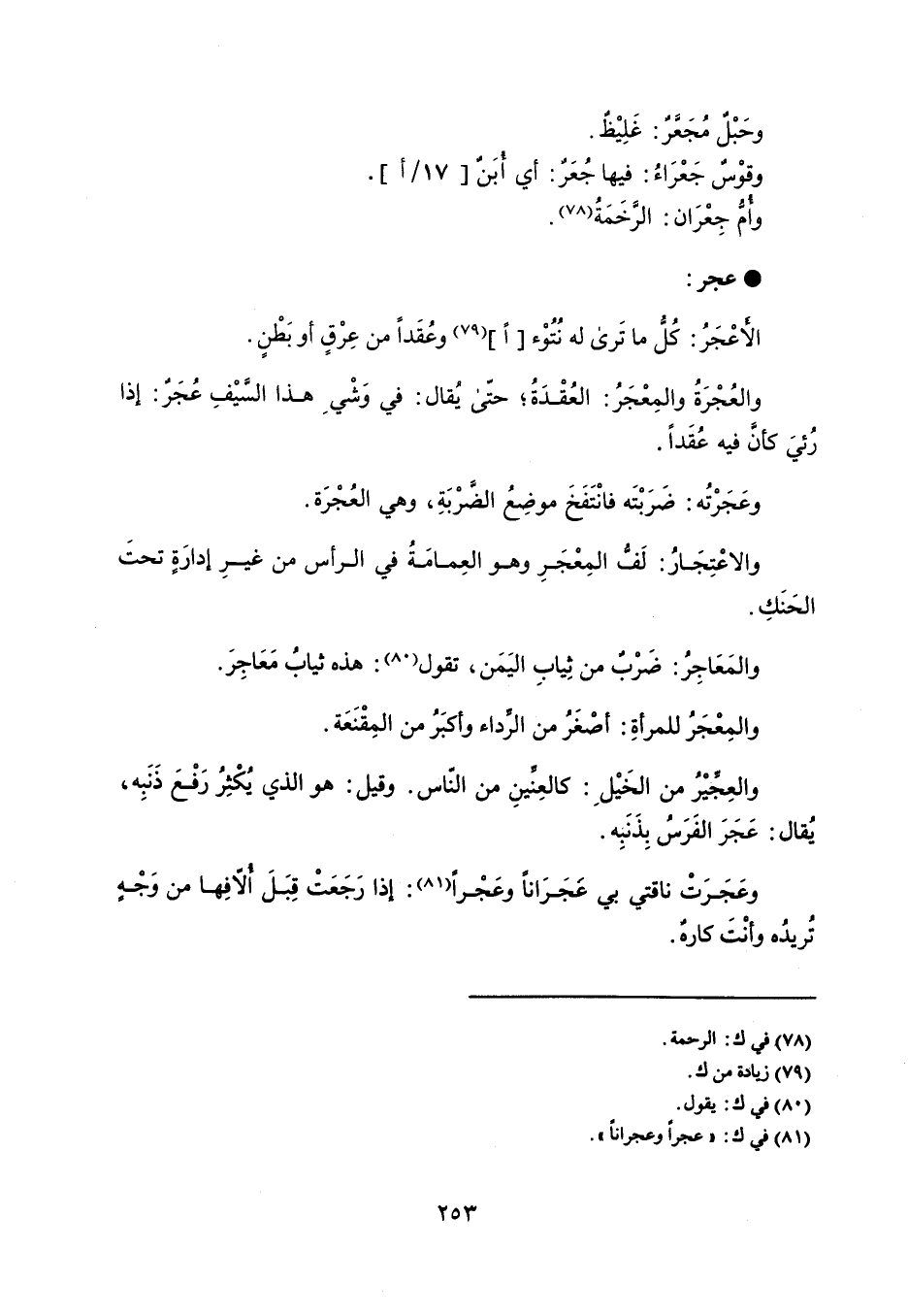 وحَبْل مُجَعَّرٌ : غَلِيْظٌ . وقوْسٌ جَعْرَاءُ : فيها جُعَرٌ : أي أبَنٌ . وامُ جِعْرَان : الرخَمَةُ . عجر الأعْجَرُ : كُل ما تَرى له نُتُوْء وعُقَداً من عِرْقٍ أو بَطْن . والعُجْرَةُ والمِعْجَرُ : العُقدَةُ ؛ حتّى يُقال : في وَشْي هذا السيْفِ عُجَرٌ : إذا رُئيَ كأنَ فيه عُقَداً . وعَجَرْتُه : ضَرَبْتَه فانْتَفَخَ موضِعُ الضرْبَةِ ، وهي العجْرَة . والاعْتِجَارُ : لَص المِعْجَرِ وهو العِمامَةُ في الرأس من غيرِ إدارَةٍ تحتَ الحَنَكِ . والمَعَاجِرُ : ضَرْبٌ من ثِيابِ اليَمَن ، تقول : هذه ثيابُ مَعَاجرَ . والمِعْجَرُ للمرأةِ : أصْغَرُ من الرداء وأكبَرُ من المِقْنَعَة . والعجيْرُ من الخَيْل : كالعِنينِ من الناس . وقيل : هو الذي يكْثِرُ رَفْعَ ذَنَبِه ، يُقال : عَجَرَ الفَرَسُ بِذَنَبِه . وعَجَرَتْ ناقتي بي عَجَرَاناً وعَجْراً : إذا رَجَعَتْ قِبَلَ ألافِها من وَجْهٍ تُريدُه وأنْتَ كارهٌ .