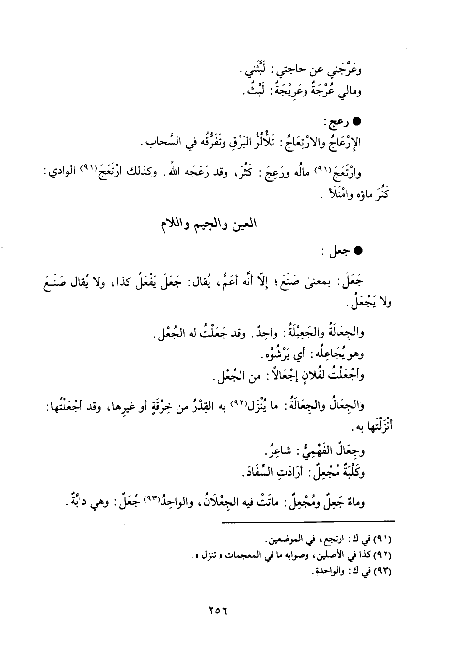 وعَرَّجَني عن حاجتي : لَبَّثَني . ومالي عُرْجَة وعَرِيْجَة : لَبْثٌ . رعج الإِرْعَاج والارْتِعَاج : تَلألؤ البَرْقِ وتَفَرُّقُه في السحاب . وارْتَعَجَ مالُه ورَعِجَ : كَثُرَ ، وقد رَعَجَه اللّهُ . وكذلك ارْتَعَجَ الوادي : كَثُرَ ماؤه وامْتلأ .